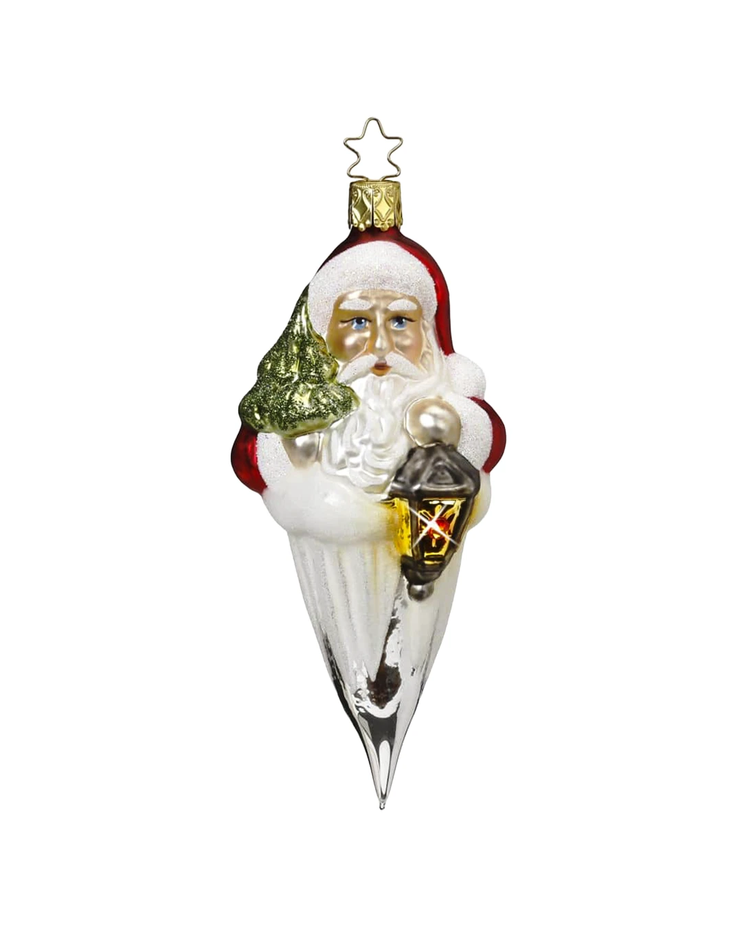 I sine arme holder julemanden en lanterne og et juletræ.