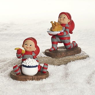 Babynisserne holder frokost er af designeren Susanna Hartmann. De finurlige babynisser har listet sig ud i spise kammeret, men nissemor ikke er hjemme. Så der bliver skovlet risengrød ind, og lækker gåsesteg. Figurerne er 8 cm høje.