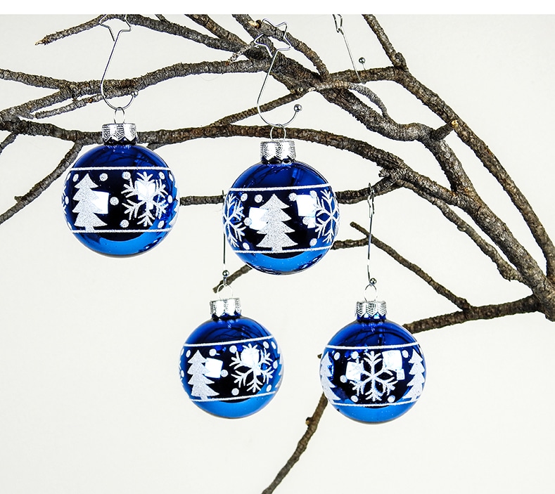 Blå blanke juletræskugler med deko Ø 6 cm. Silkematte blanke blå kugler, med smukt deko af træer, snefnug. Størrelsen Ø 6 cm.