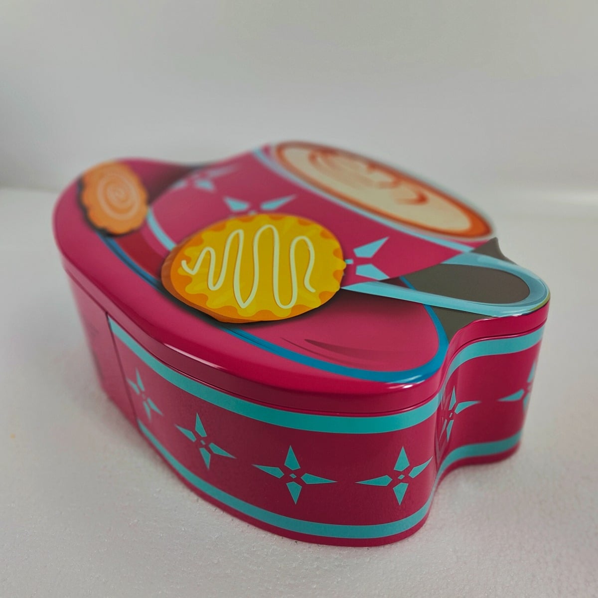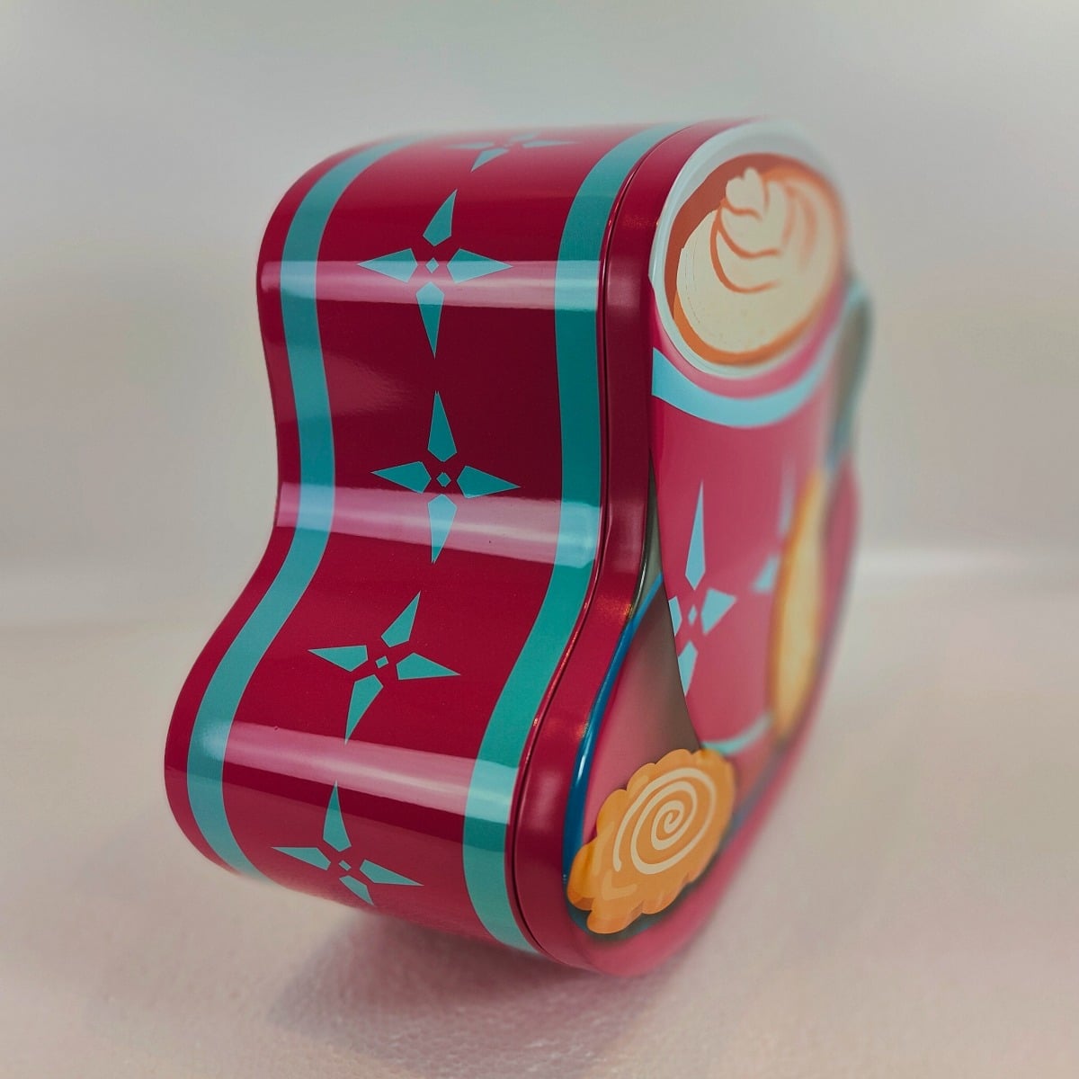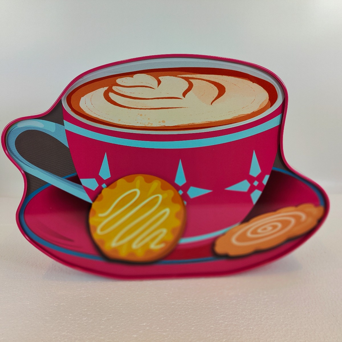Dåsen er formet som en stor kaffekop i pink med turkise detaljer og småkager på underkoppen – et design, der oser af humor og hygge. Den perfekte gaveidé til kaffeelskeren eller som et dekorativt indslag i køkkenet.