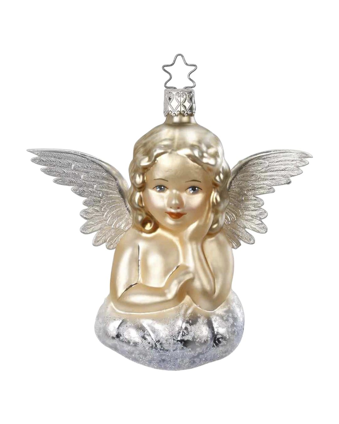 Engle på sky juletræskugle 11 cm, er i mundblæst glas. Med flotte sølvvinger. Smuk håndlavet engle på sky i glas, som er mundblæst og hånddekoreret. Ø 10 cm. Prisen er pr. stk. Glas juletræskugler, spir, juletræstoppe er et gammelt erhverv, som stadig håndhæves i dele af EU og Østlandene, man mundblæser de fleste glaskugler, juletræs spir, juletræstoppe enten i frihånd, eller ved hjælp af forme. Vores leverandører er stadig i besiddelse af de gamle forme, og herved fremkommer, de meget gammeldags og traditionelle glas juletræs kugler, juletræs spir, juletræstoppe. Når kuglerne er formet, bliver de efterfølgende hånd dekoreret. Derfor kan der forekomme uregelmæssigheder, da disse kugler er et håndarbejde, lavet af kyndige mundblæsere indenfor glas juletræskugler.