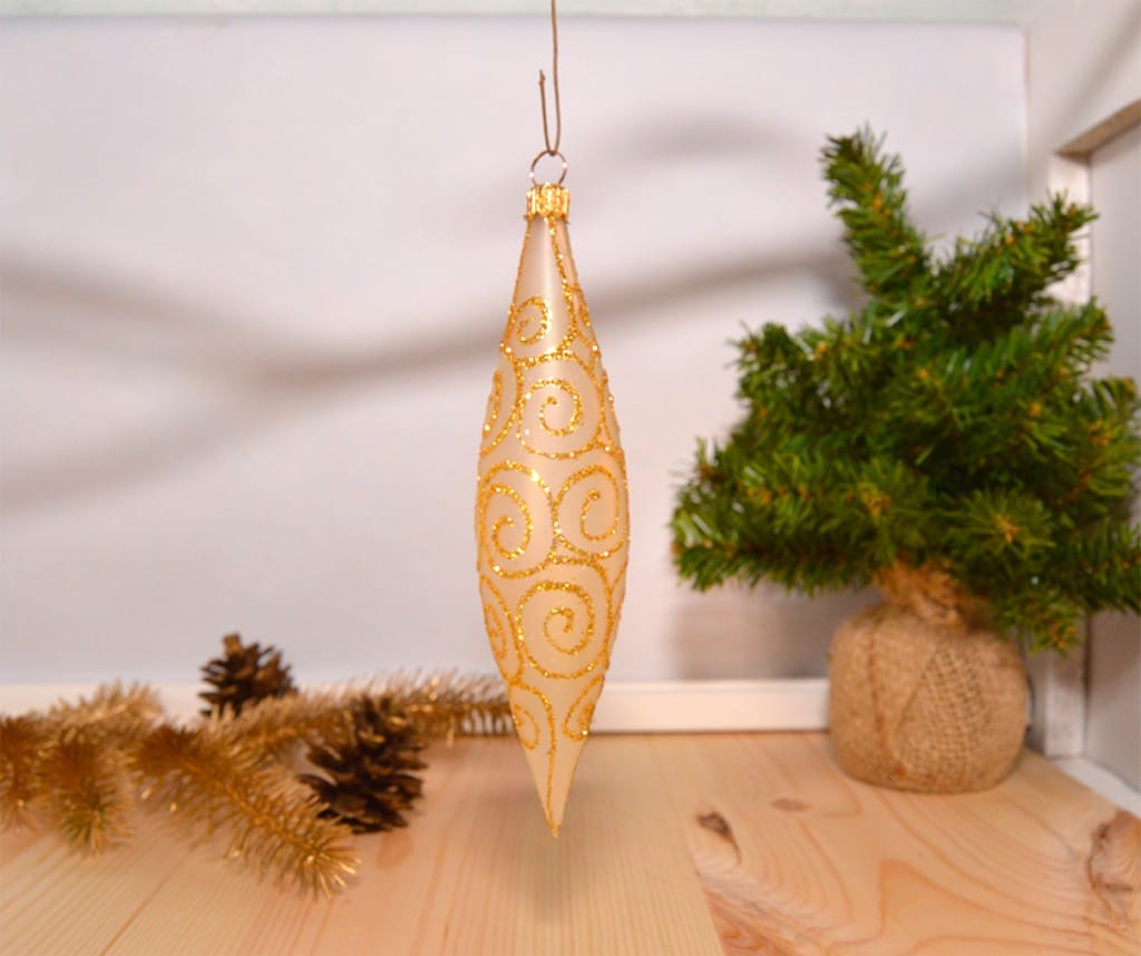 Frostet glas juletræskugler med guld dekoration. Juletræskuglerne er mundblæste, hånddekoreret og yderst sjælden. Kuglerne stammer fra et gammel overgemt laver, fra begyndelsen af 1980. Juletræs spidserne er fantastiske flotte når lyst falder blødt på dem. Smukt dekoreret med med flotte guldsnoninger.