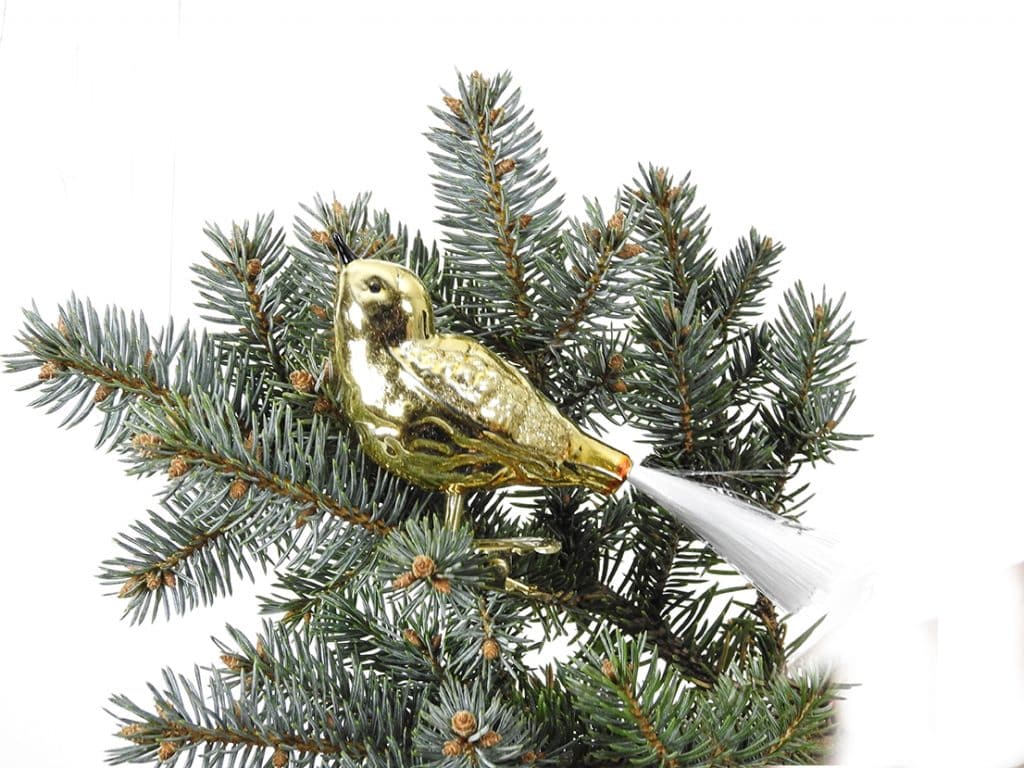 Fugl med clips i antik guld med fiberhale , er i højglans mundblæst glas. 13 cm.