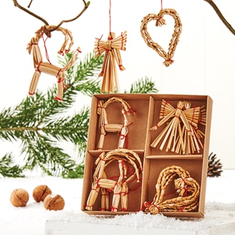 Smukke halmbukke, engle, og hjerter til at hænge på juletræet, vinduer, juledekorationer, eller laves om til en uro.