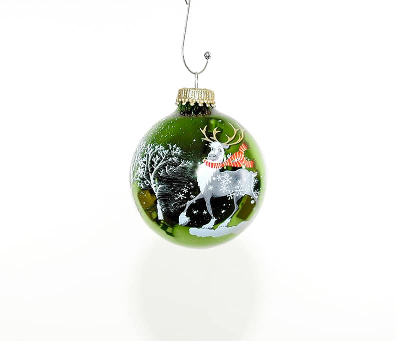 Grøn Rudolph juletræskugle. Rudolph juletræskugle, i duset grøn, silkematte og blanke glas juletræskugler. Med smuk dekor, og ikke mindst den glade Rudolph, med sit smukke røde halstørklæde.