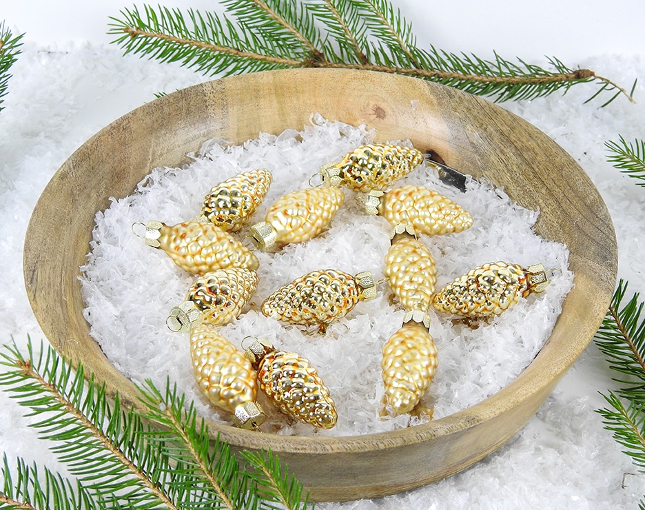 Farve: Guld silkematte og blanke glas juletræs kogler.