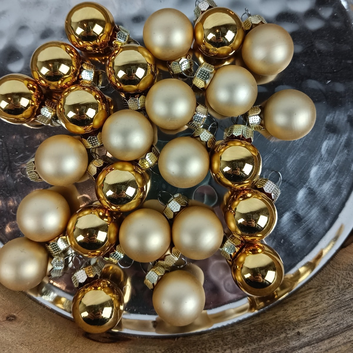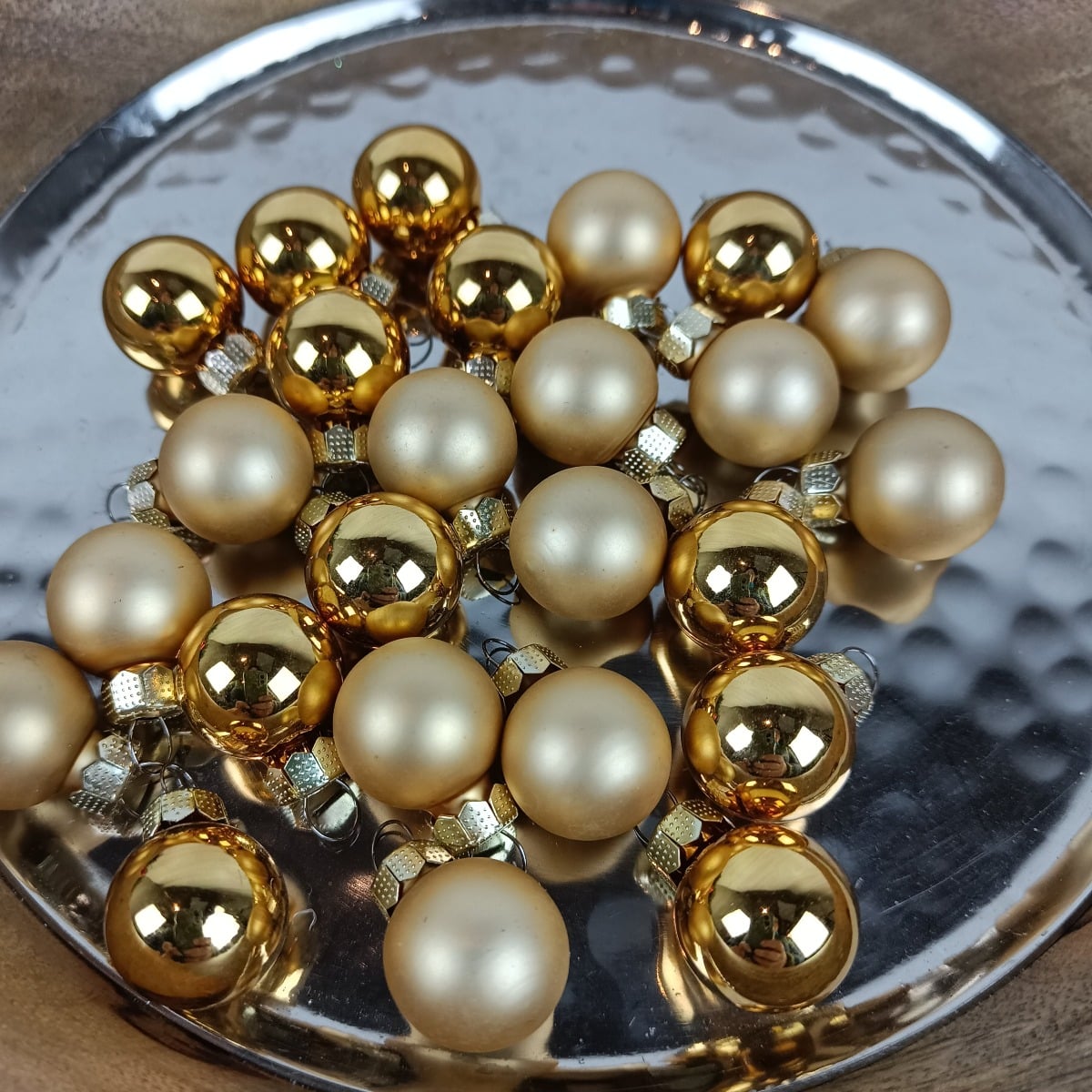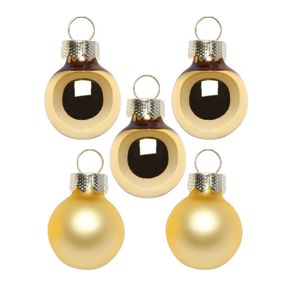 Flotte små silkematte og blanke guld glas juletræskugler i Ø 2,5 cm til dekorationer, kranse, juletræet mm. 25 stk. pr. æske Materiale: Glas