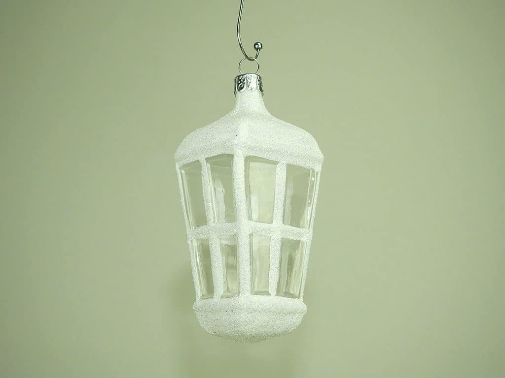 Hvid lanterne juletræskugle med vinduer, i klart glas. Sne belagte lanterne, mundblæst glas juletræskugle, med klare glas vinduer.