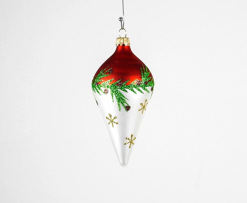 Hvid og rød spids juletræskugle med gran bælte