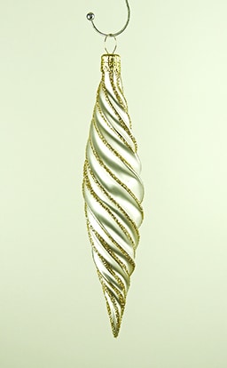 Hvid snoet dråber juletræskugler 14 cm, dekoreret med tynd guld glimmer, på en hvid silkemat bund.