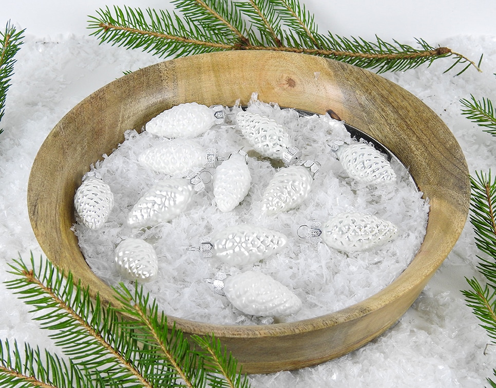 Hvide glas juletræs kogler. Silkemat og blanke, hvide og sølv glas juletræs kogler 4.5 cm. Farverne hvide og sølv.