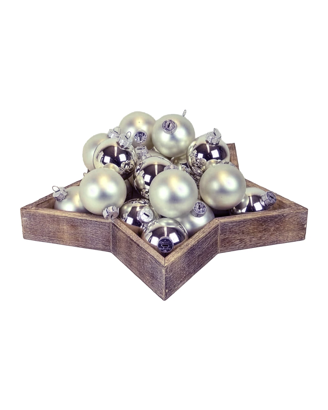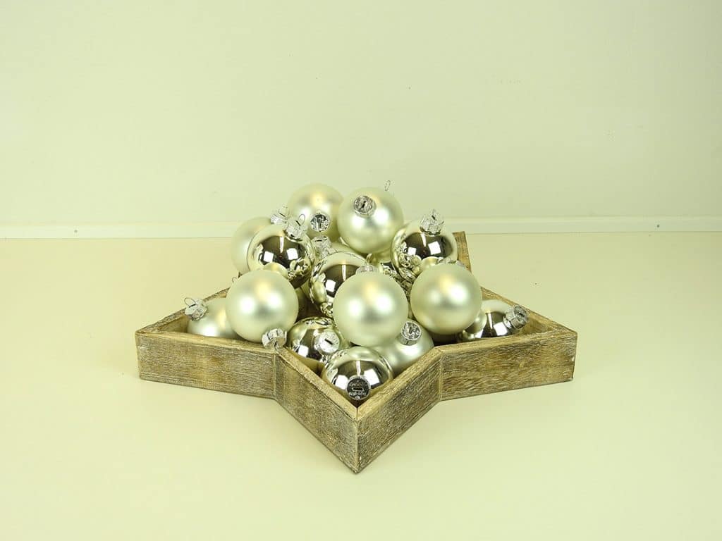 Hvide og sølv silkematte og blanke juletræskugler Ø 6 cm.