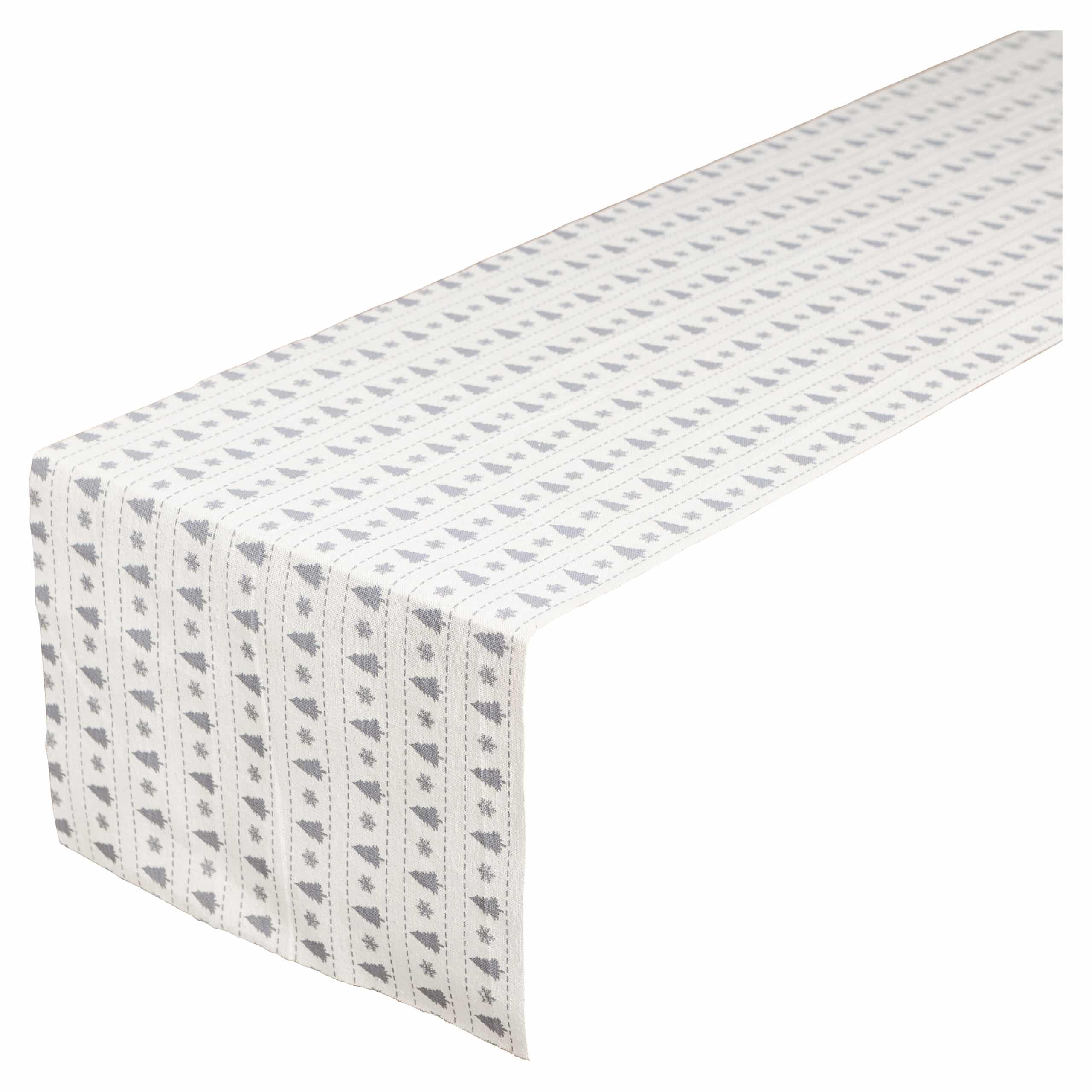 Skab en elegant og vinterlig stemning med vores julebordløber med grå juletræer og snefnug.