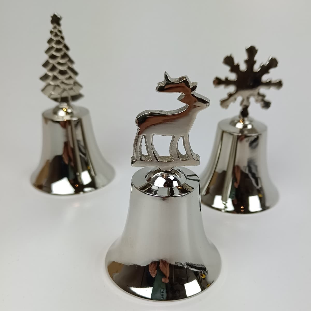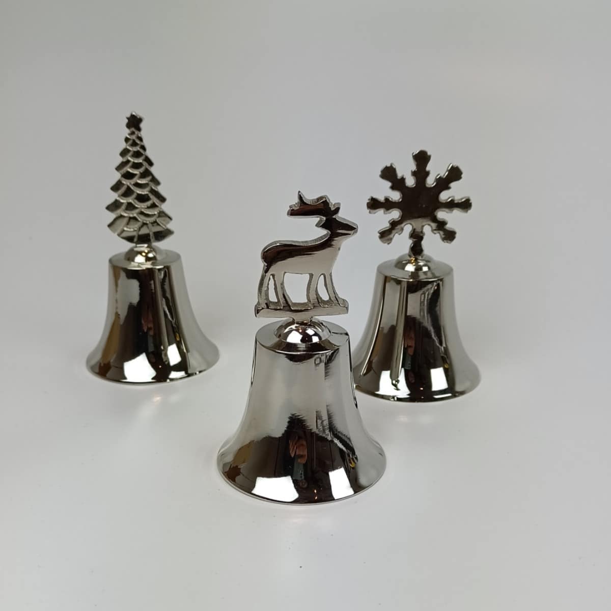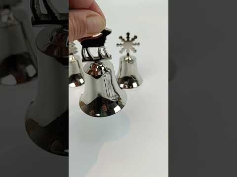 Sød klokke med hjorten på toppen. Klokken kan anvendes af julemanden, eller måske fruen i huset, når nissebanden skal komme og spise. Højglans poleret metal. Hj 9 cm Ø ved klokke 6 cm Se video