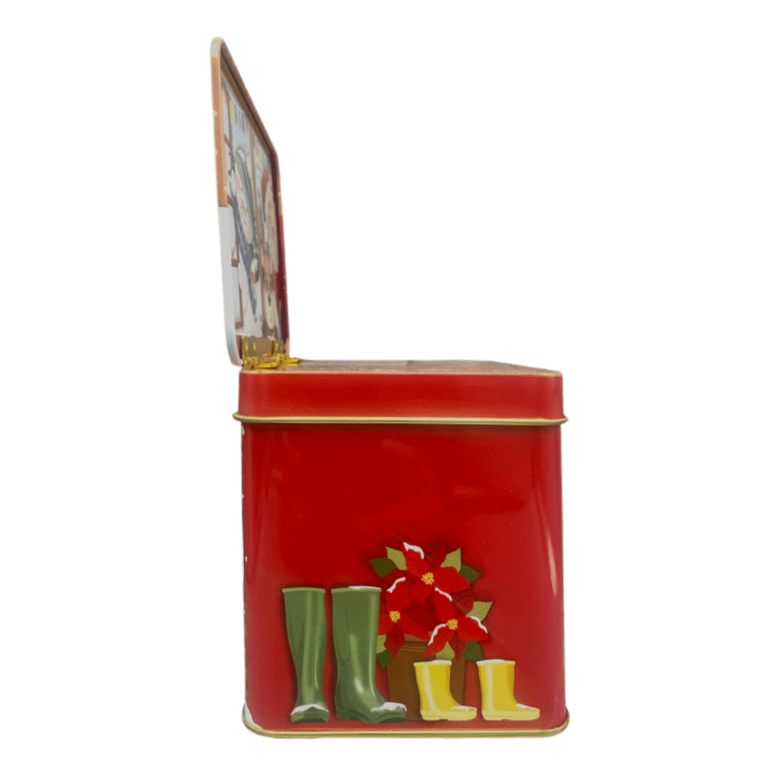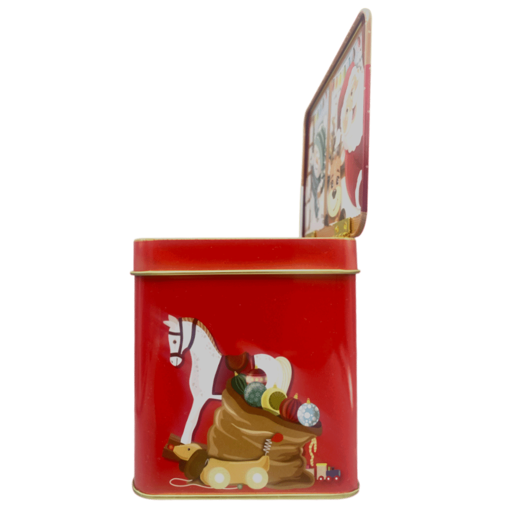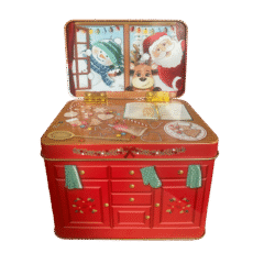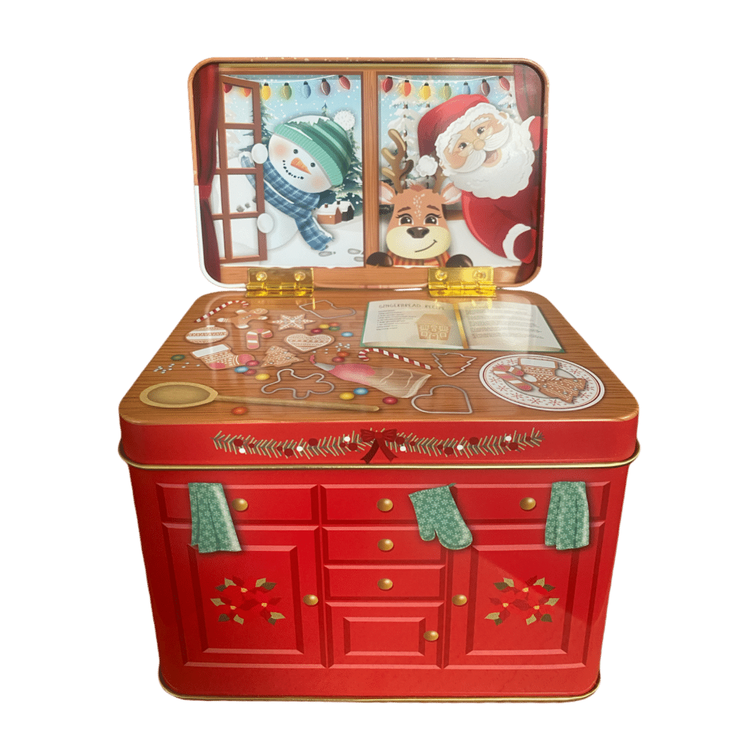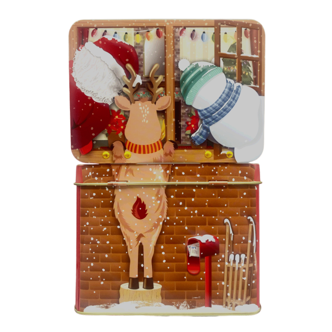 På bordpladen er der gang i småkager bageriet, og ind ad vinduet står julemanden, Rudolf og Hr Snemand og hilser på, da de kan lugte de lækre småkager.