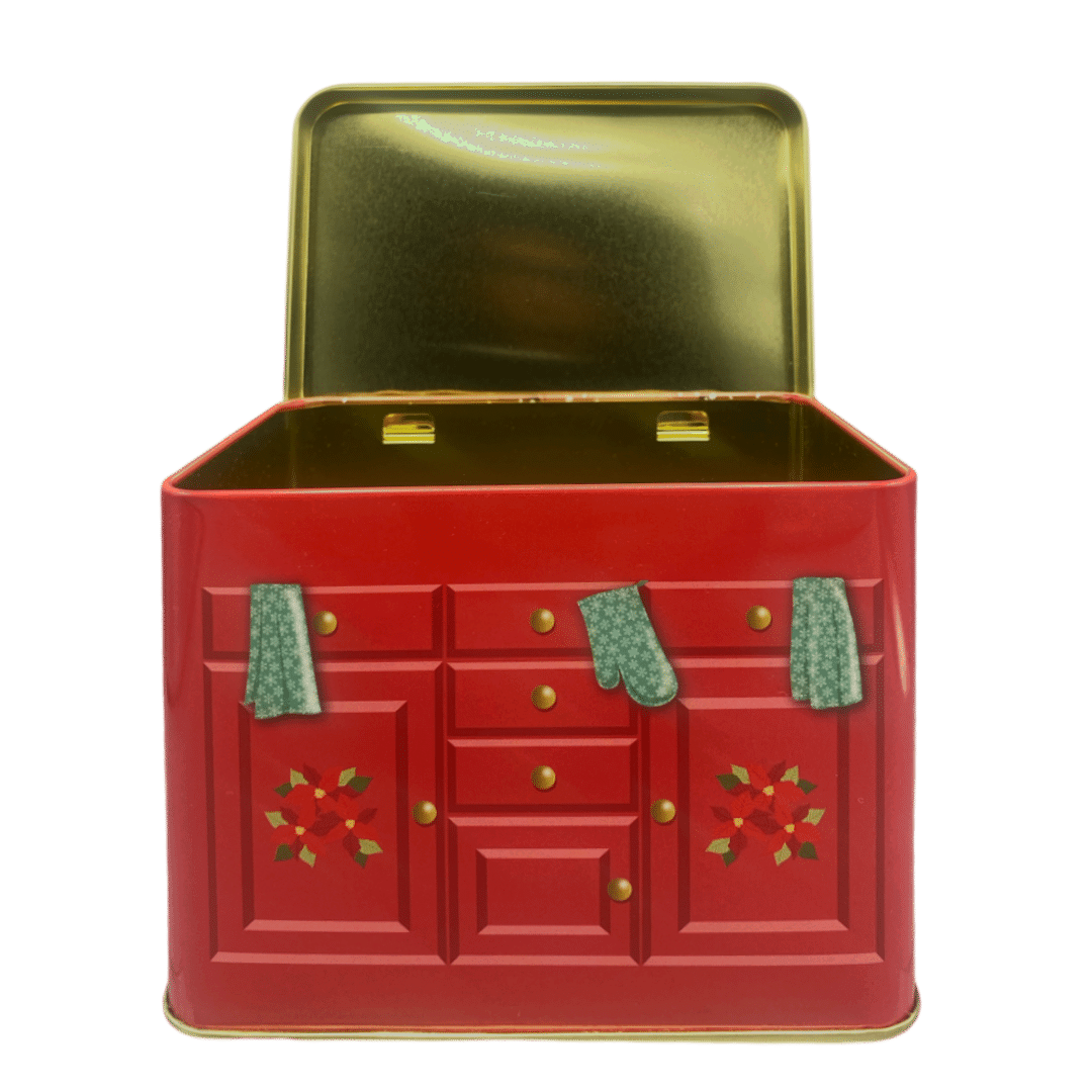 Fronten er udsmykket med guld ranke med sløjfe of røde bær, jule viskestykker og grydelap.