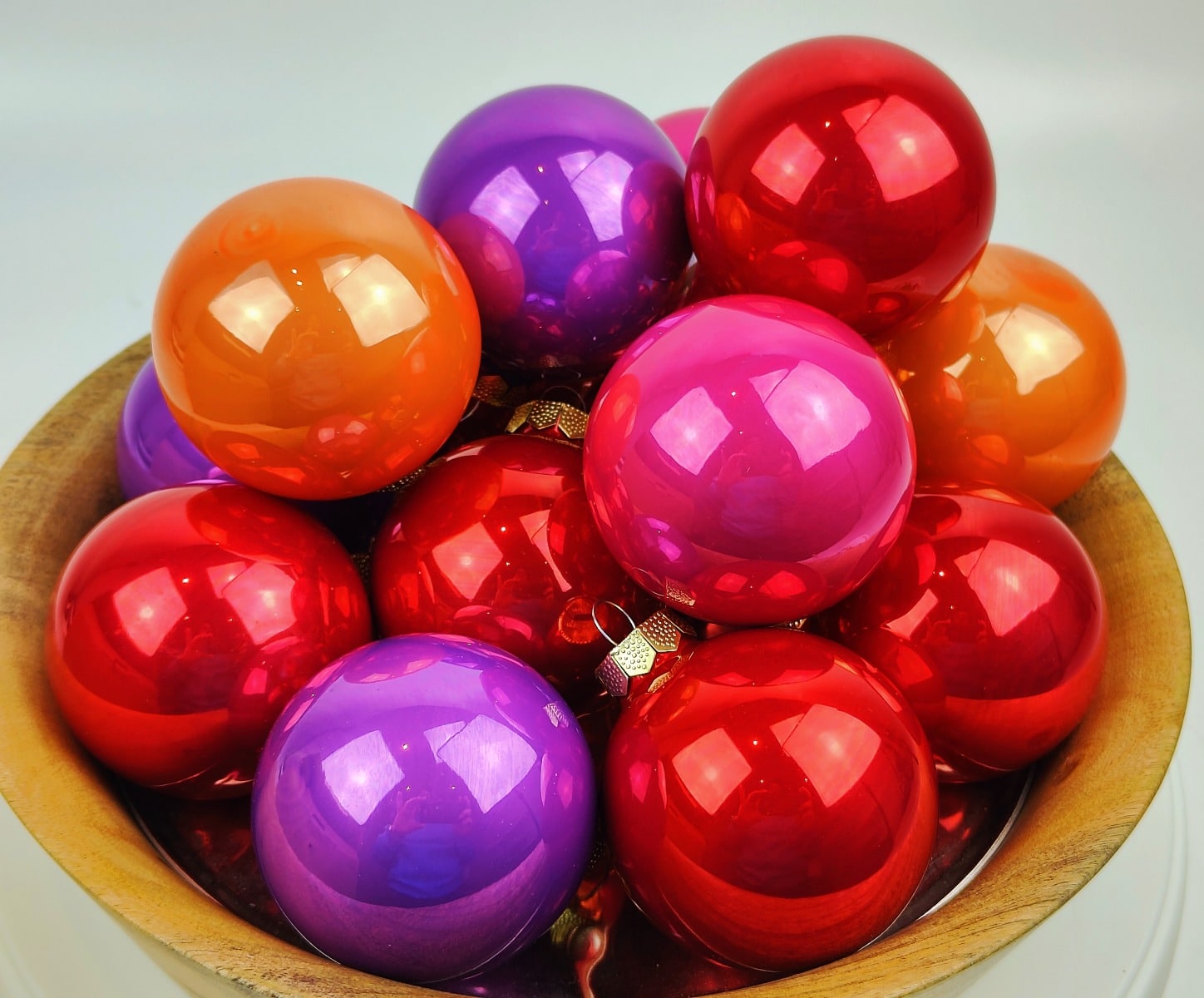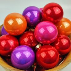 Juletræskugler i glas til juletræet, med lidt spræl på farverne, som er orange, lilla, pink og rød.