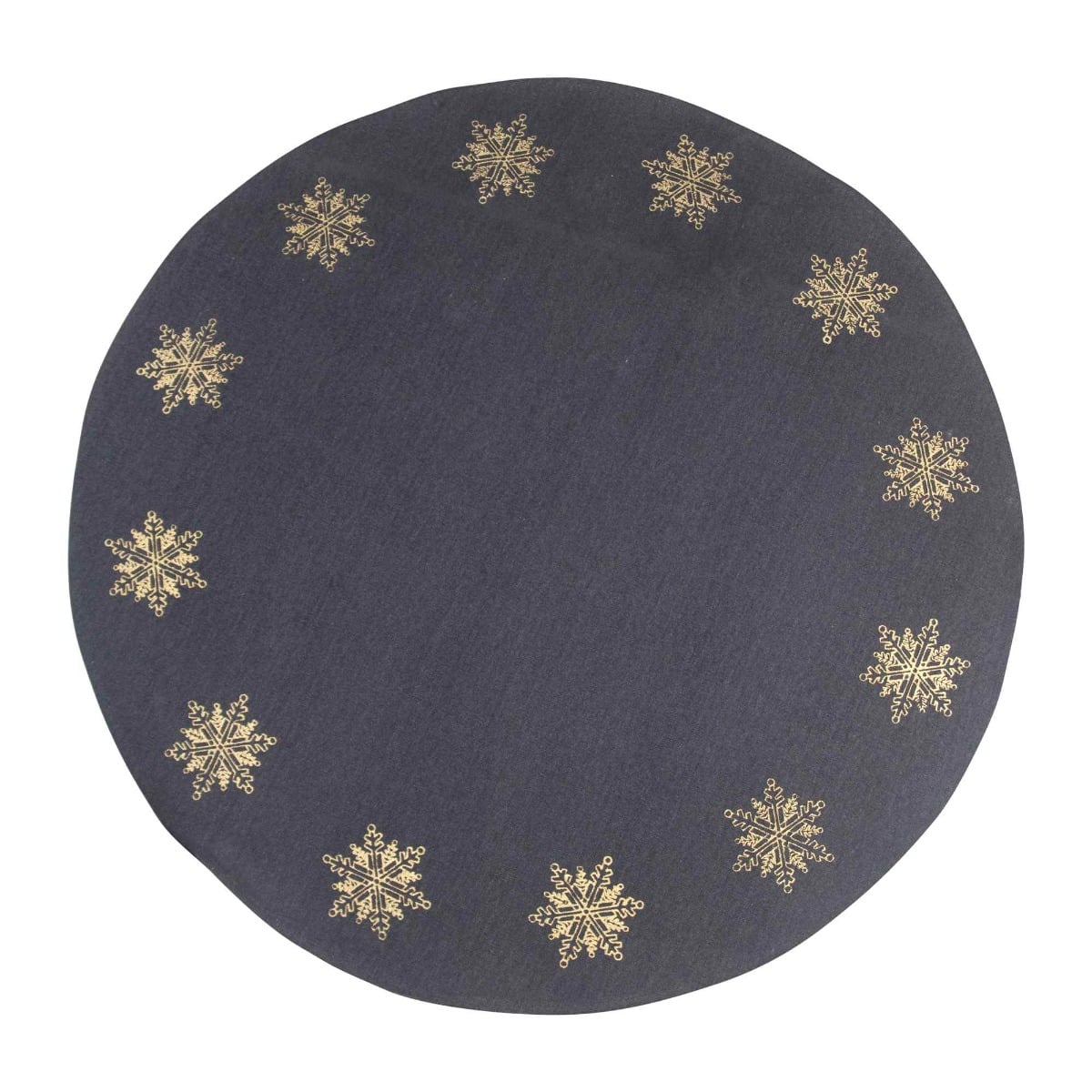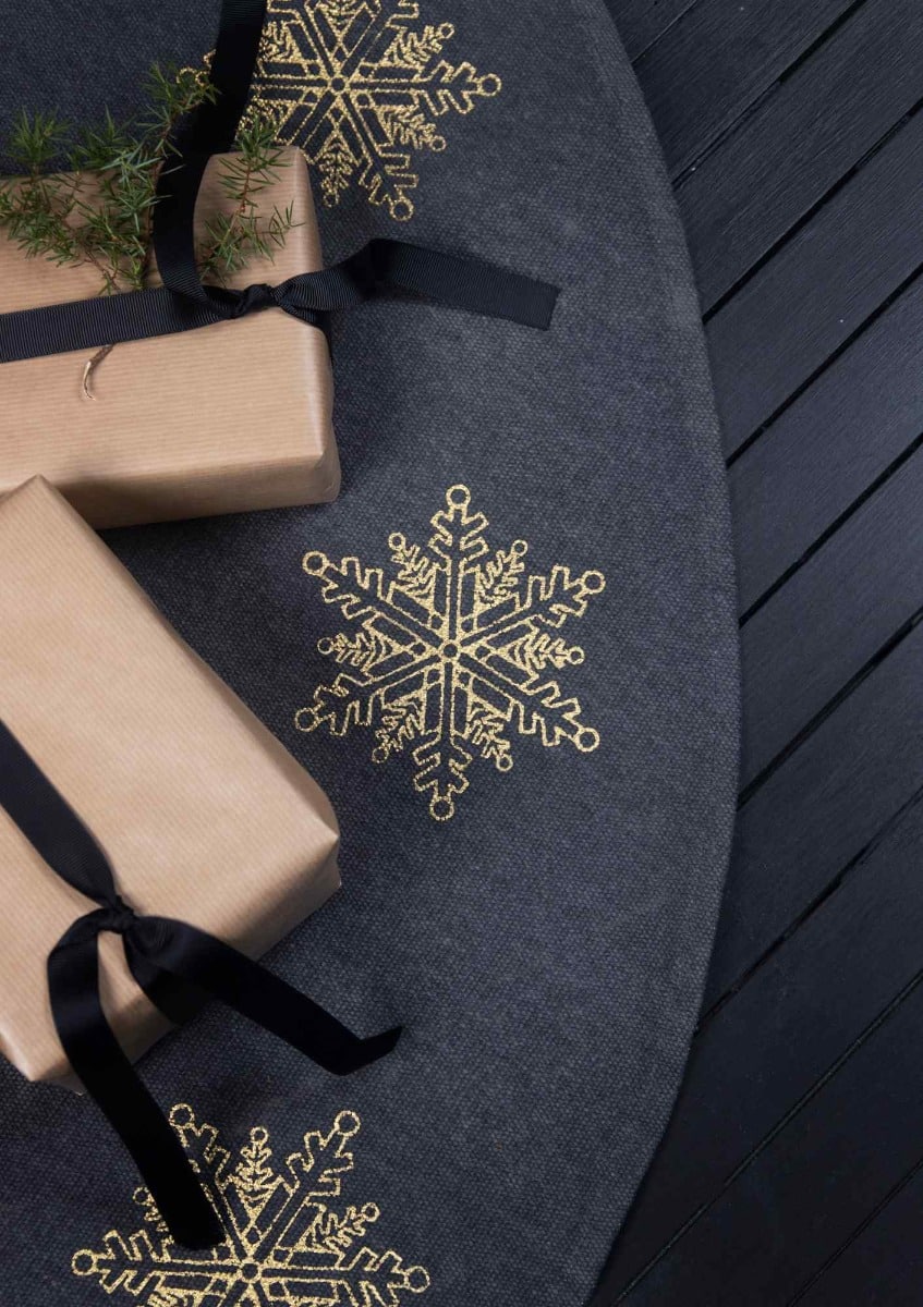Gør julen ekstra elegant med dette smukke juletræstæppe med snefnug, som danner en perfekt ramme om dit juletræ. Tæppet er udført i en flot grå bundfarve med gyldne snefnug i et klassisk mønster hele vejen rundt – en enkel og stilren kombination, der giver et eksklusivt udtryk under træet.