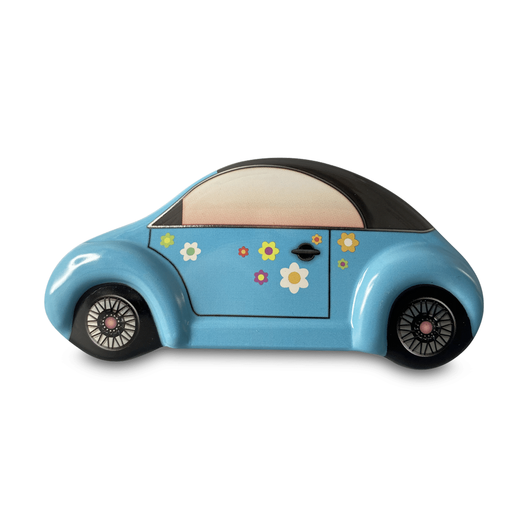 En sød og sjov anderledes dåse, der kan bruges til mange formål, og er lidt hippie over den, med de flotte blomster på bilen.