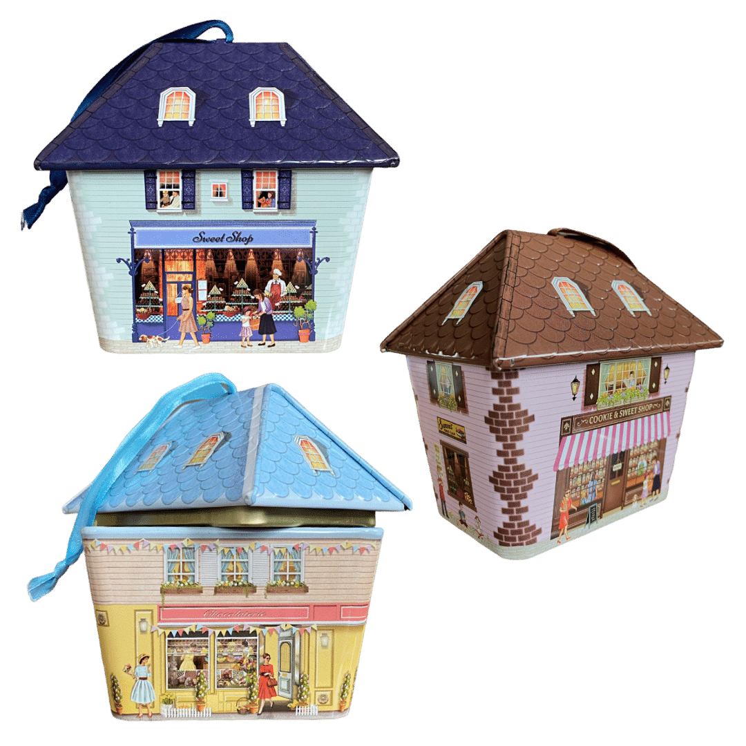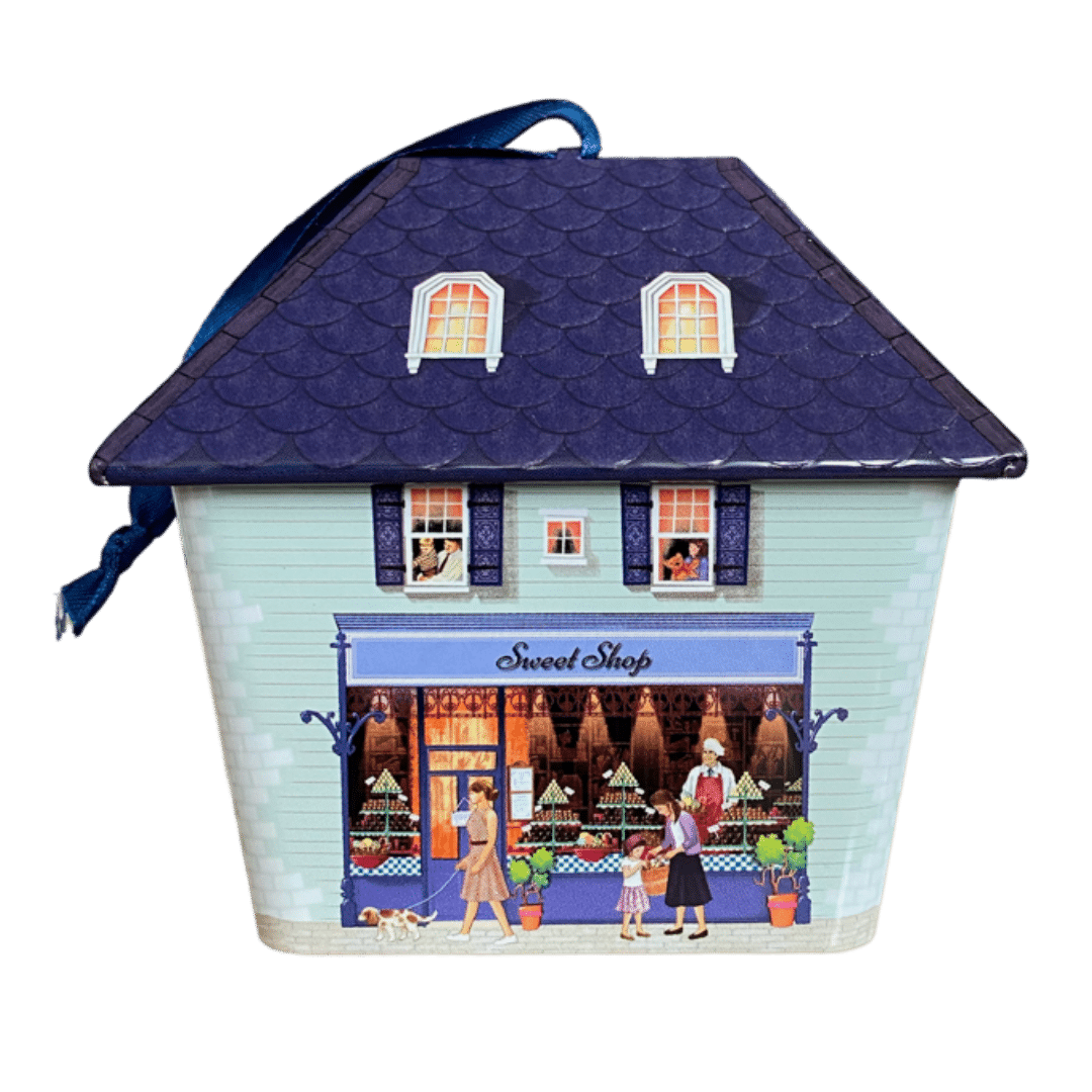 Kagedåse hus med slik og kaffe butik er en charmerende lille metaldåse, der kombinerer nostalgi og finesse i ét og samme design.