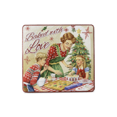 Sjov gammeldags retro firkantet kagedåse, hvor mor og børn, er i gang med at bage jule småkager.