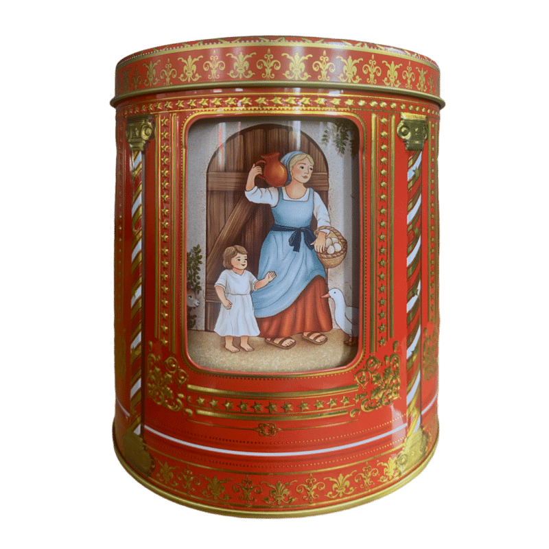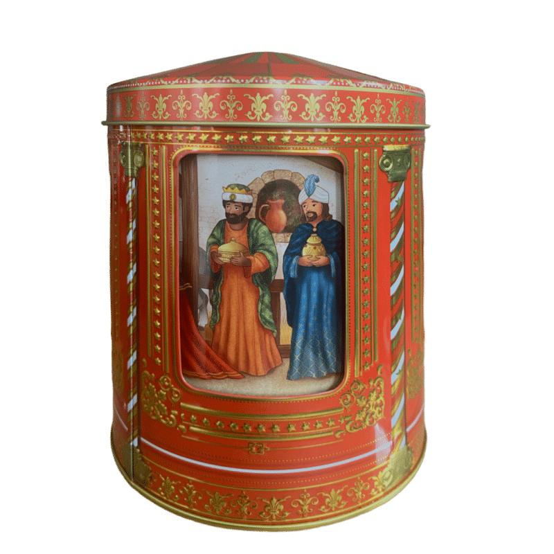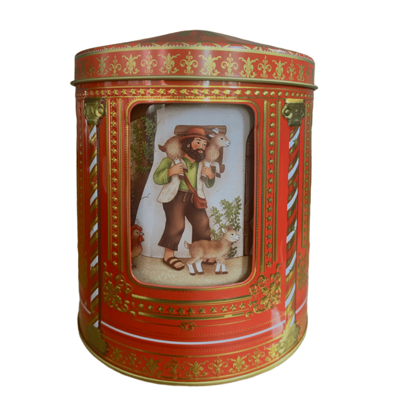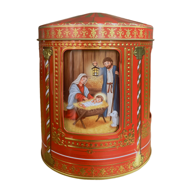 Kagedåse Jule Evangeliet spilledåse er en enestående og stemningsfuld kagedåse, der forener klassisk julefortælling med nostalgi og funktion. Den er dekoreret med smukke motiver fra Juleevangeliet – Jomfru Maria, Josef, Jesusbarnet i krybben samt stalddyr og de tre vise mænd – alt sammen gengivet i varme farver og fine detaljer.