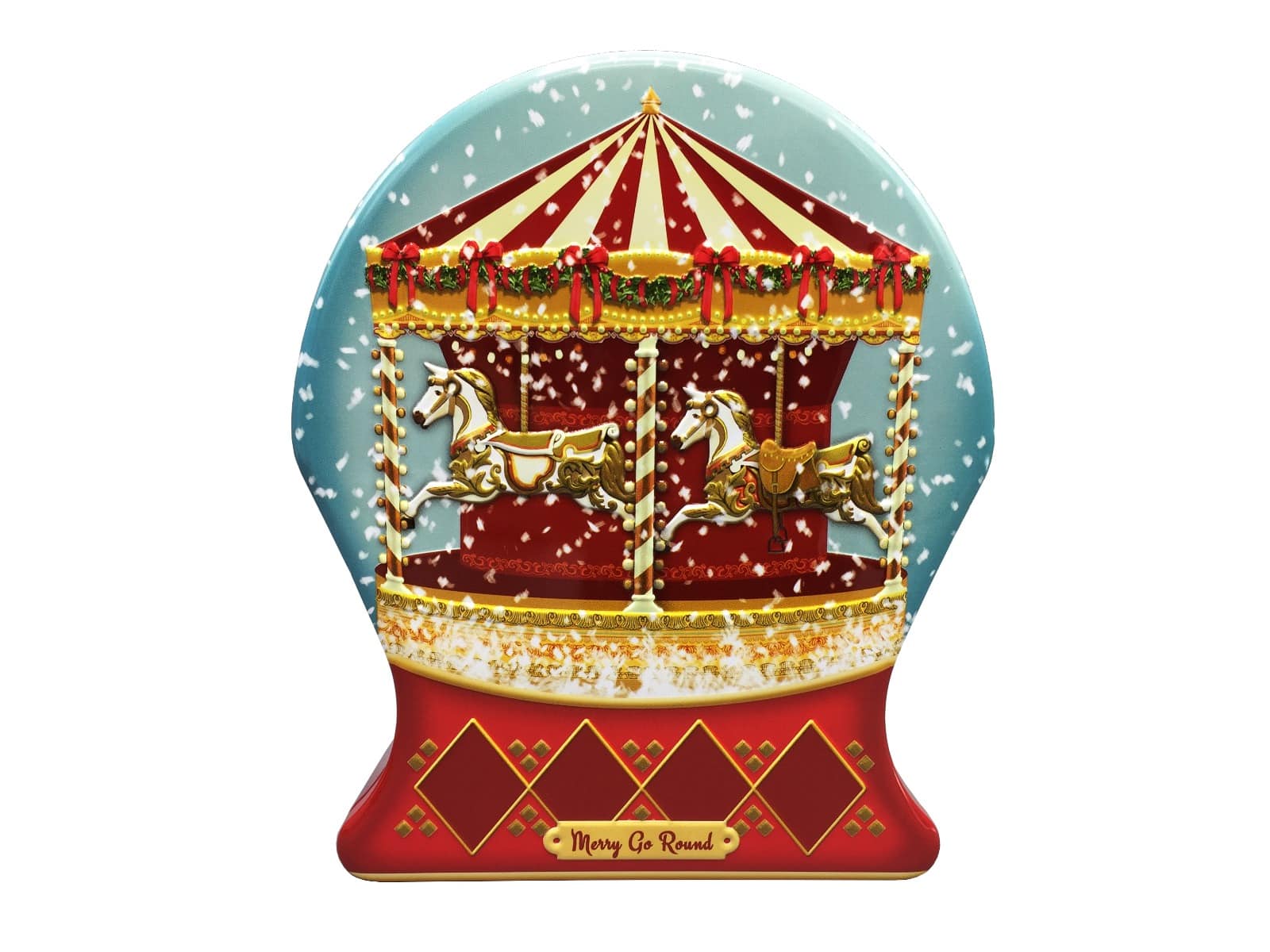 Kage dåsen med det skønne sne landskab, hvor den jule pyntet julek arrusel, med hestene. En sød og anderledes kagedåse, der bare i sig selv, er meget dekorativ. Flot som værtindegave, måske med hjembagte småkager, i stedet for en blomst. Vores anderledes og specielle kage dåser, stammer fra en helt specielt leverandør.