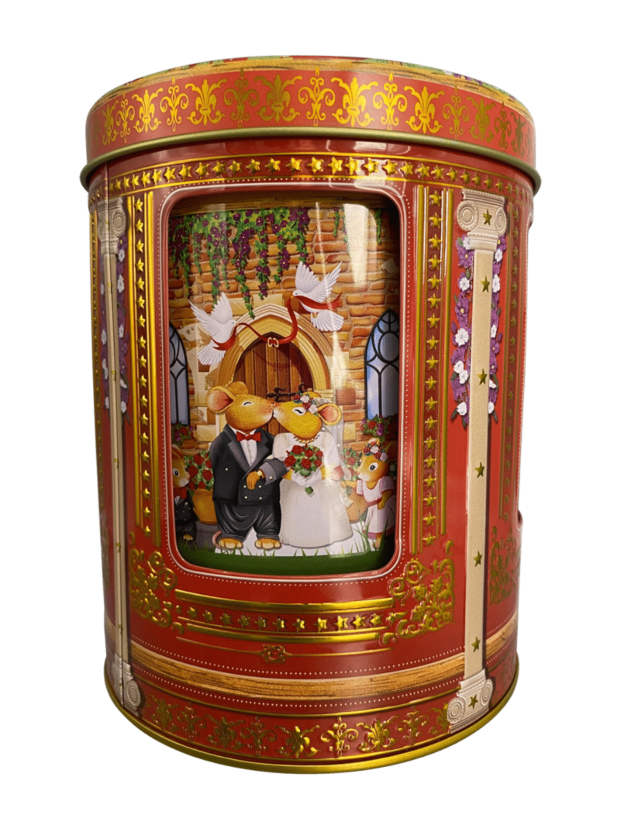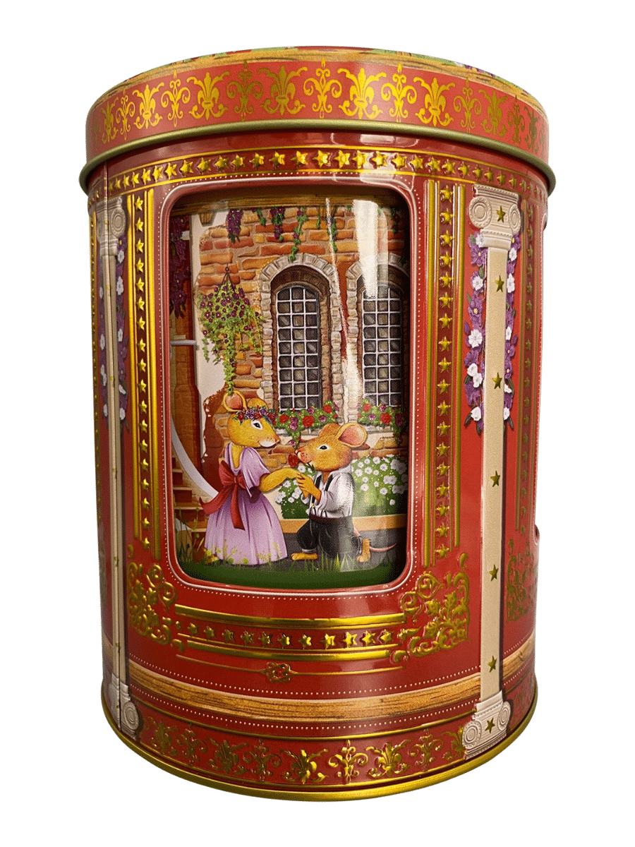 Kagedåse Jule Musepar Spilledåse er en fortryllende og romantisk juleklassiker fra Silver Crane, som kombinerer musik, nostalgi og håndværksmæssig finesse. Dåsen viser et sødt julemotiv med et musepar i kærlighedens tegn – fra den første flirt til det store bryllup, smukt illustreret i varme farver og detaljerede omgivelser.