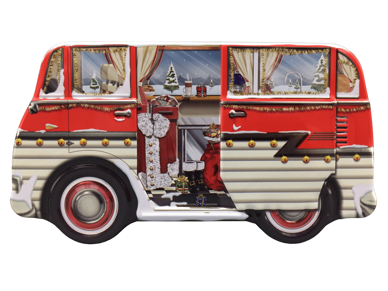Julemandens autocamper kagedåse, som han bruger hele julen, hvor han har julegaver, og sit kostume opbevaret.
