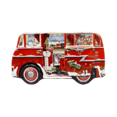 Autocamperen kagedåsen er pyntet op til jul, og med ski og juletræet på taget.