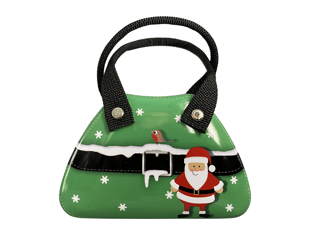 Sød grøn lille taske med julemanden på, er en kagedåse til lidt lækkert når man skal på arbejde, til pakkekalender, eller en lille værtsgave.
