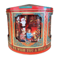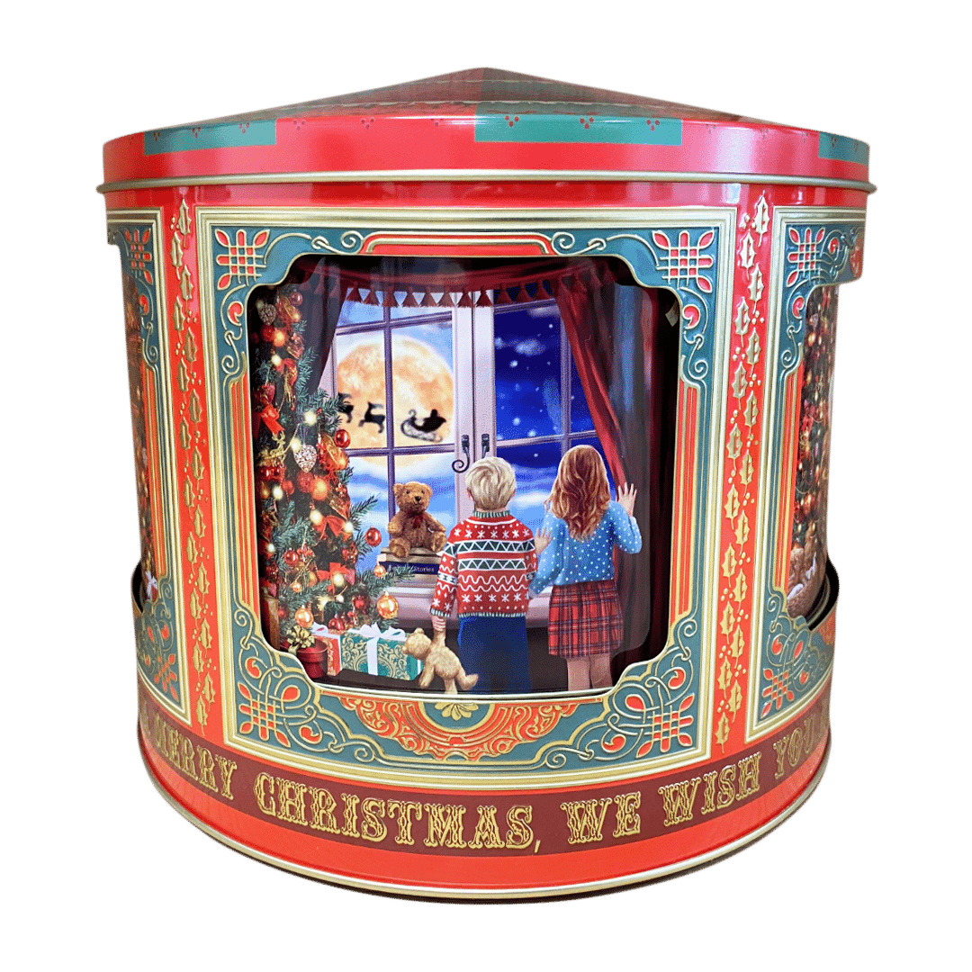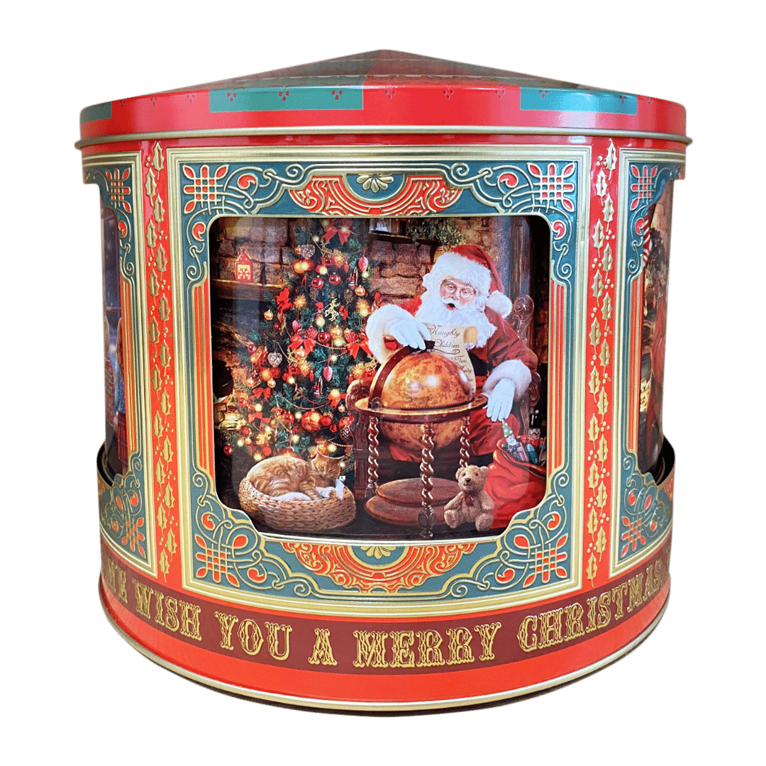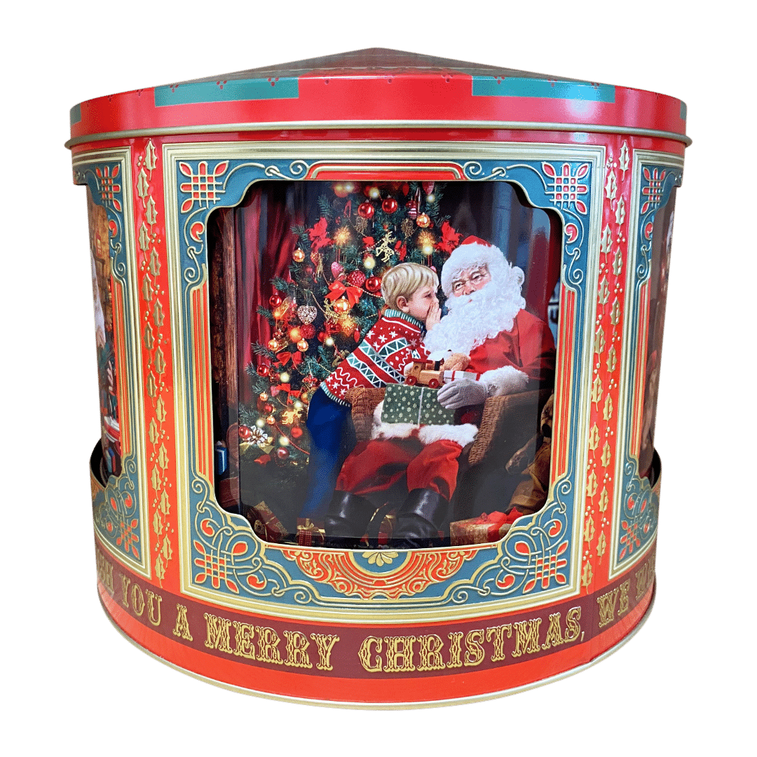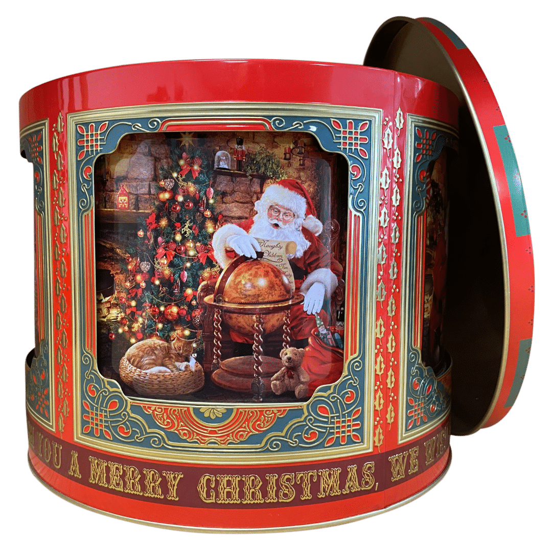 En stor dejlig kagedåse der kan rumme mange småkager til julemand, og skulle han dukke op on natten, sladre spilledåsen, når der pilles ved låget.