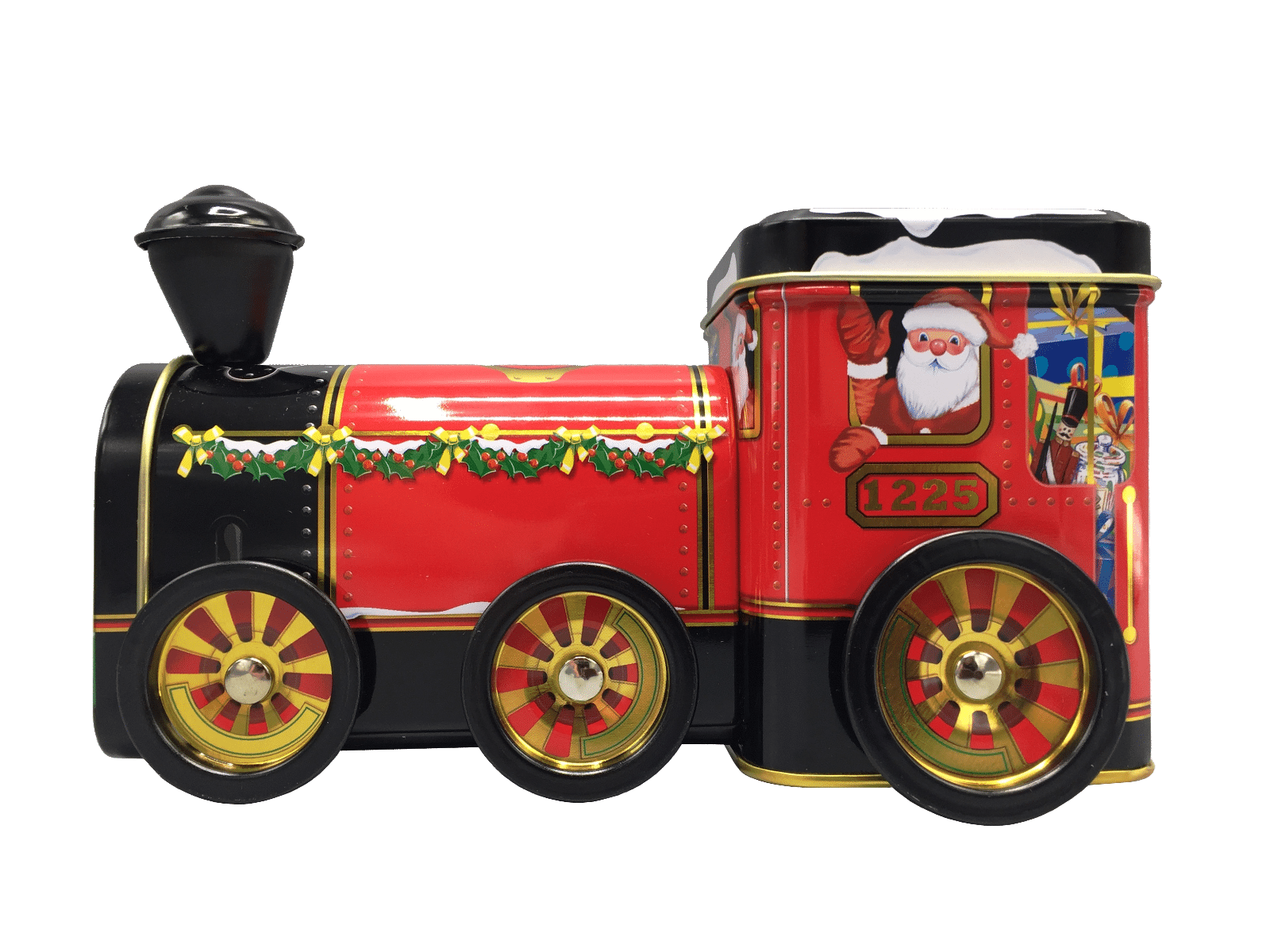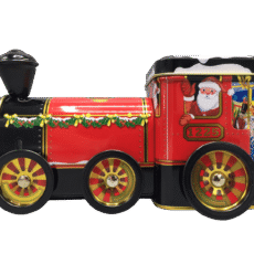 Gammeldags lokomotiv med selveste julemand, som lokomotivfører.