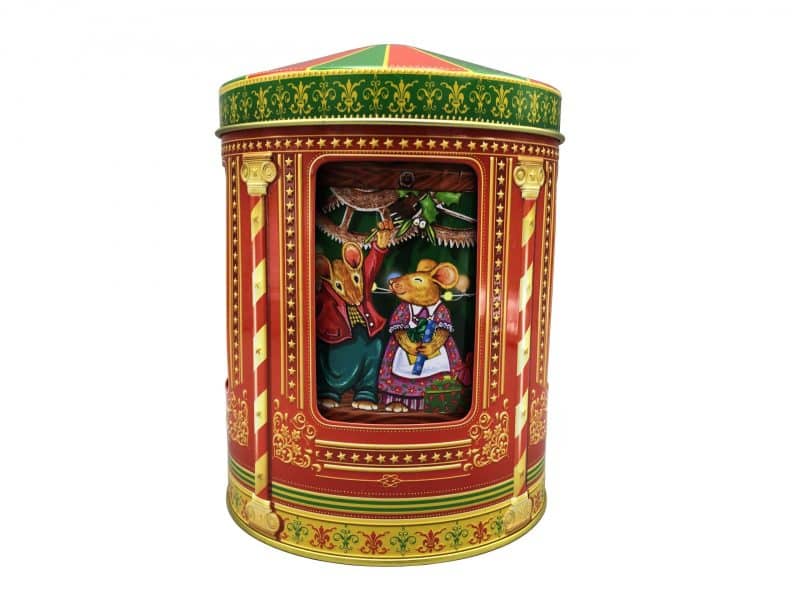 Kagedåse Julemus karrusel spilledåse er en fortryllende og nostalgisk juledekoration, der kombinerer funktion, sjæl og musik i ét. Den smukt dekorerede dåse viser et hyggeligt motiv med julemus, der pynter op og står under misteltenen – klar til et julet kys.