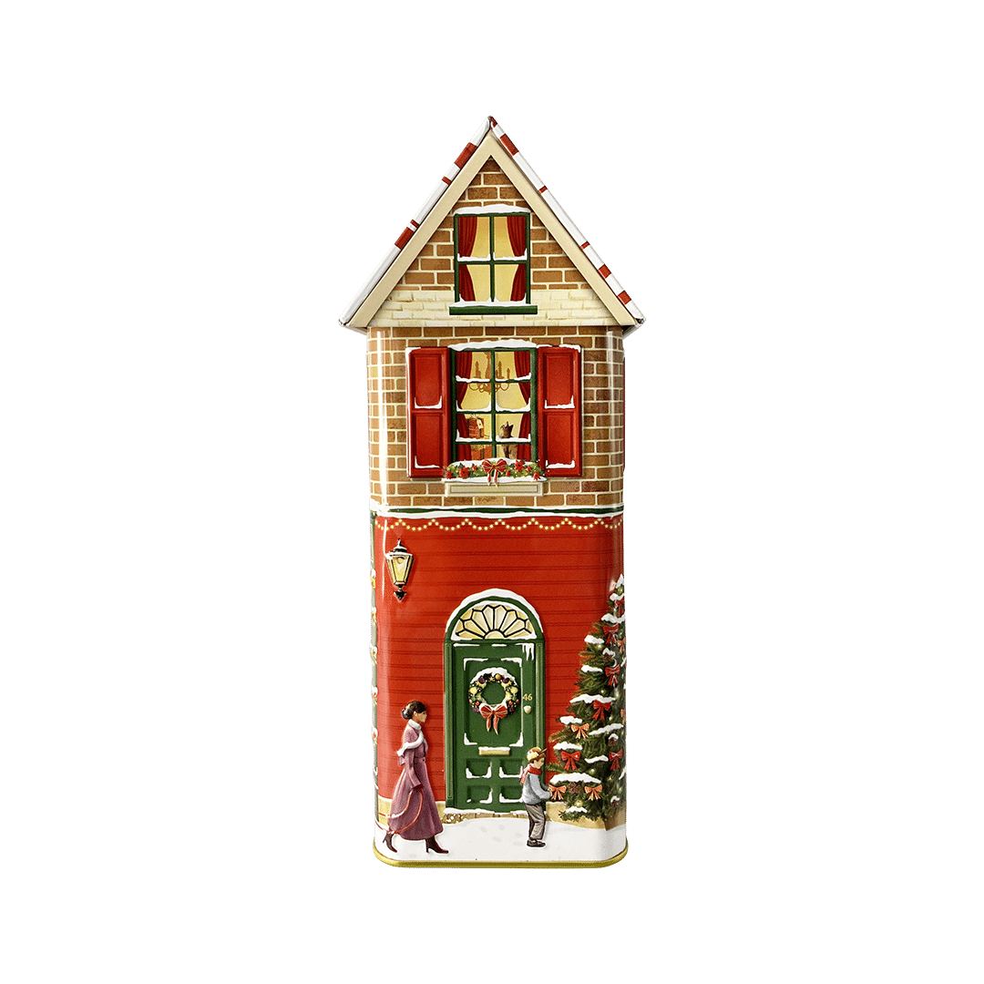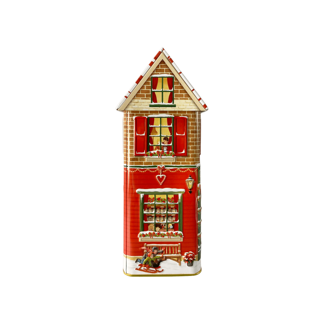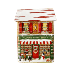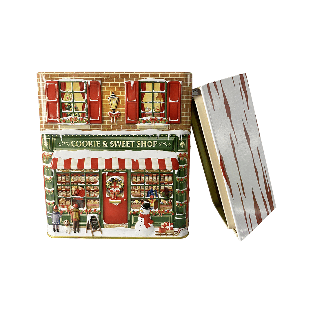 Fronten af kagedåsen er super flot jule dekoreret, og på bagsiden ser man det smukke butiksvindue, med alle julegodter.