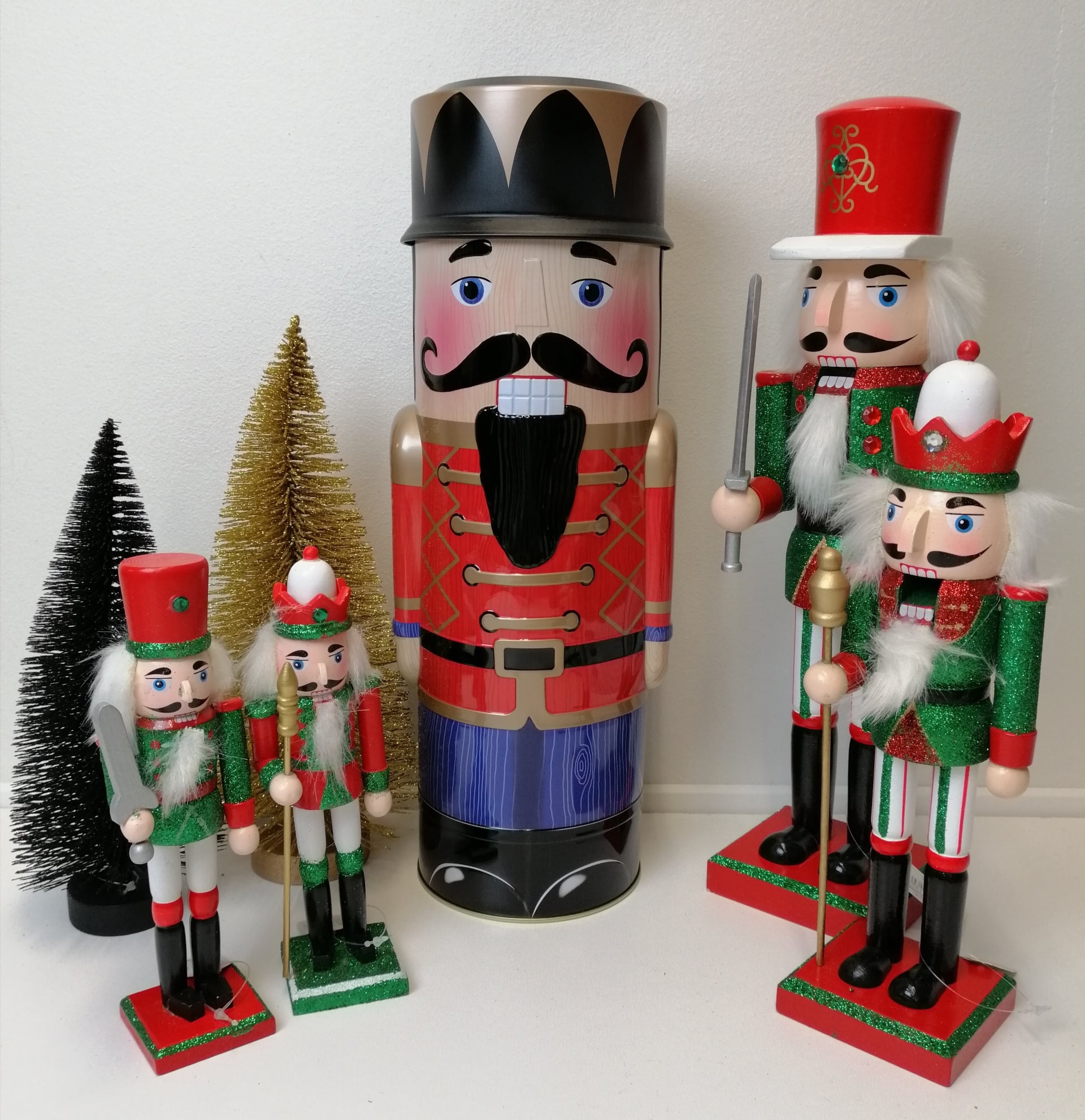 Kagedåse -sStor og majestætisk nøddeknækker, der står høj og rank i sin fine uniform, fungere som en kagedåse.