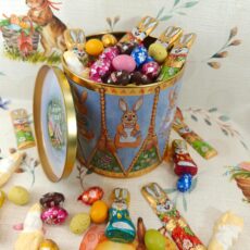 Kagedåse udsmykket med de søde Hr. og Fru Påskehare, hele vejen rundt på trommen, som bare venter på, at komme i brug.