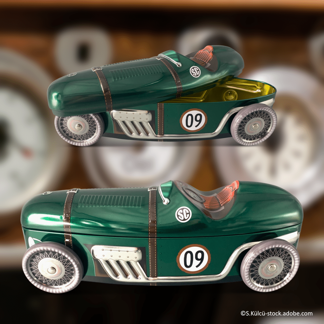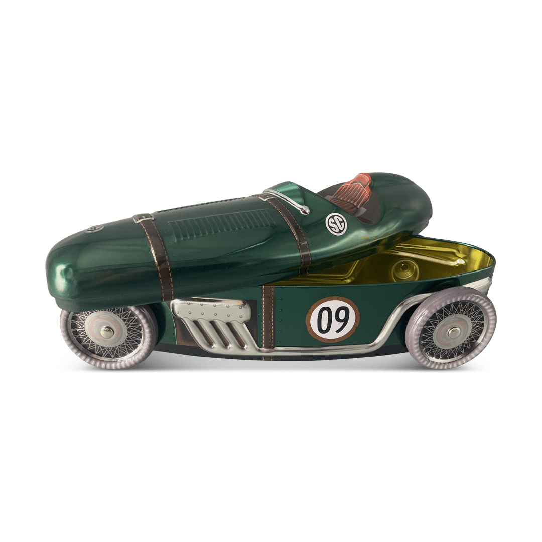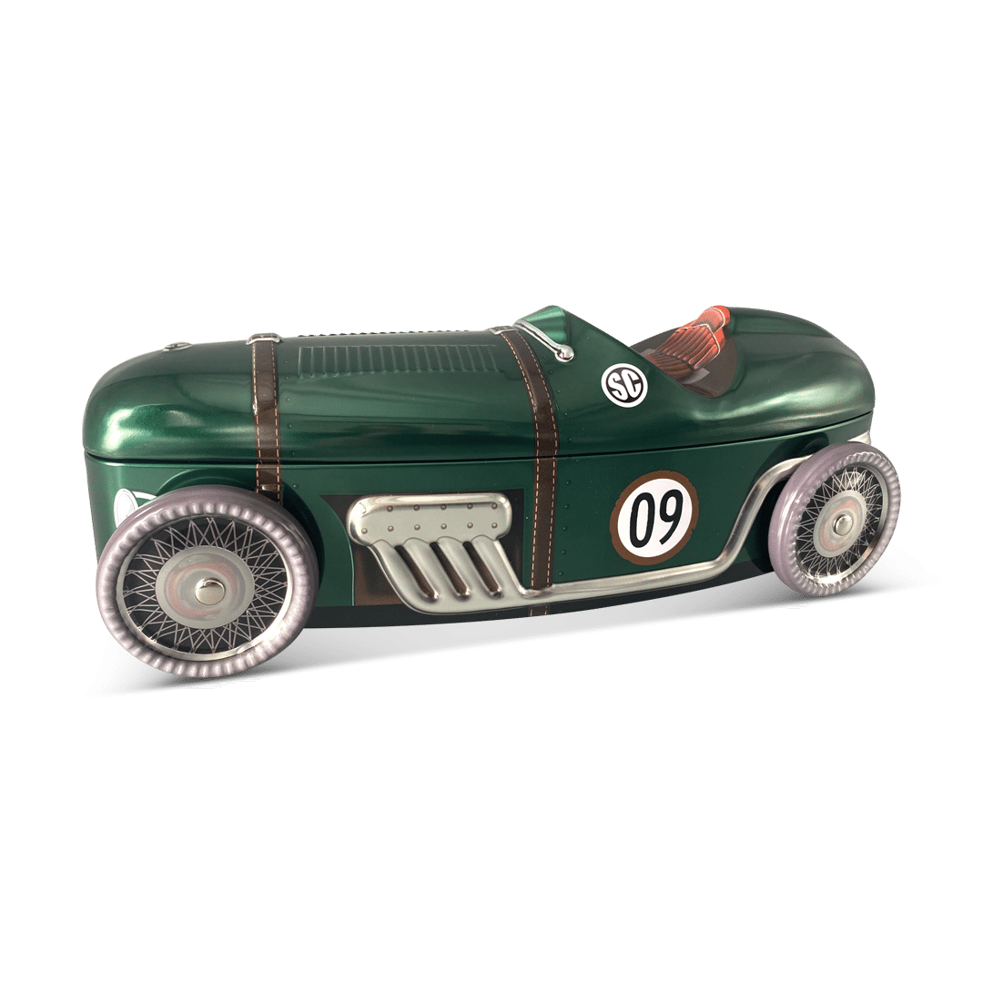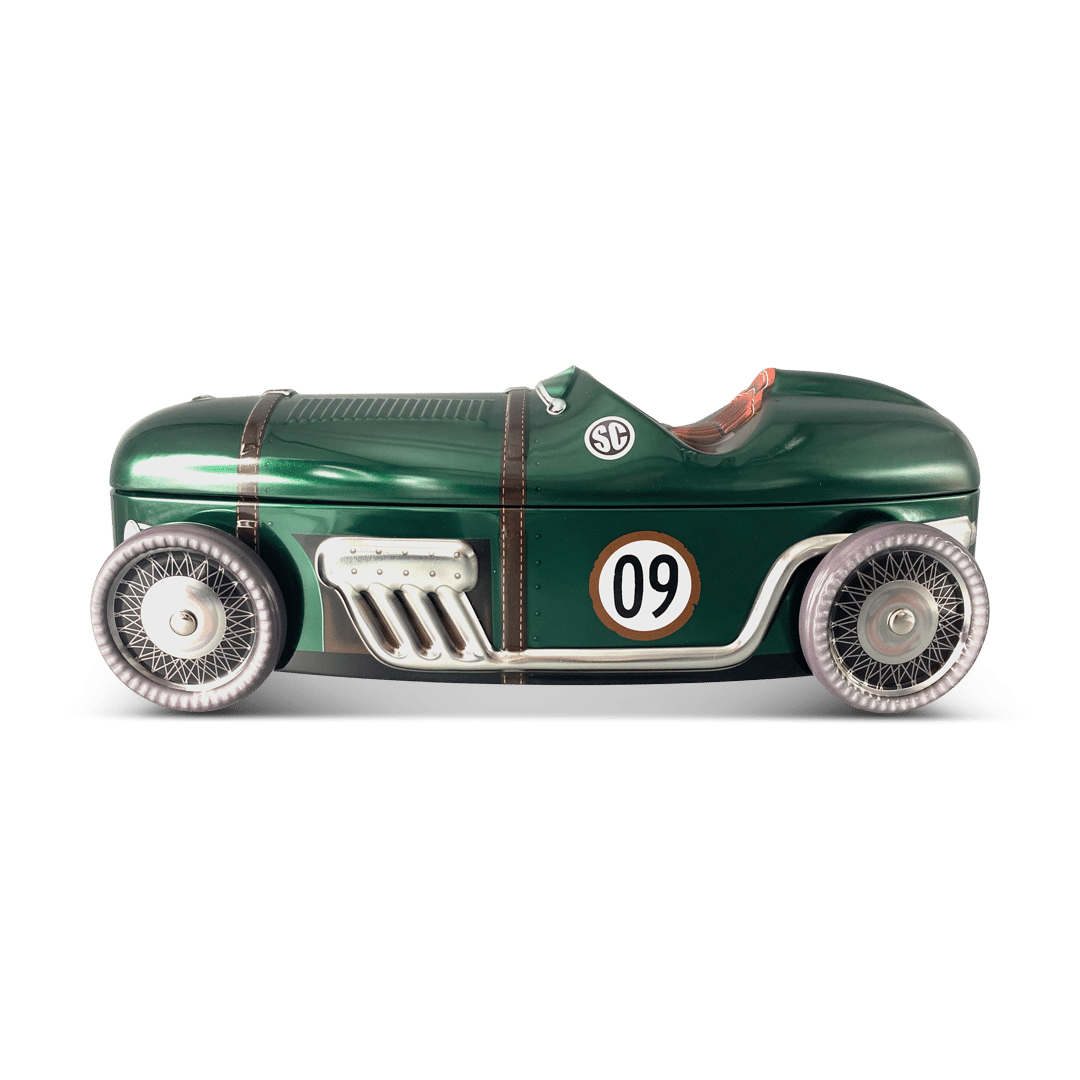 Kagedåse Grøn Racerbil 09 er en retroinspireret og stilfuld kagedåse fra Silver Crane, der kombinerer klassisk britisk design med legende charme. Dåsen er udformet som en vintage racerbil i dyb britisk grøn med brune læderdetaljer og nummer 09 på siden – et must-have for enhver bilentusiast eller samler.