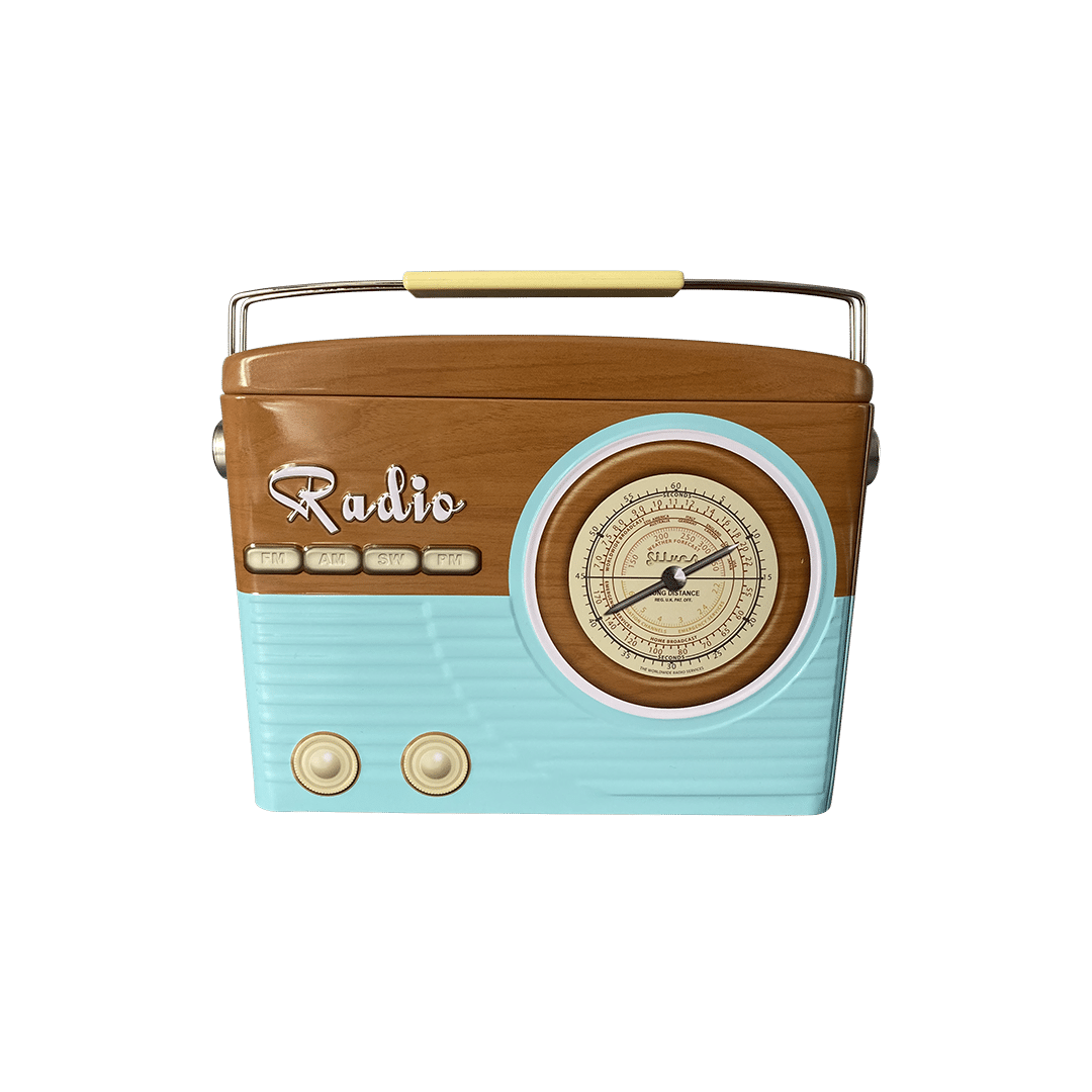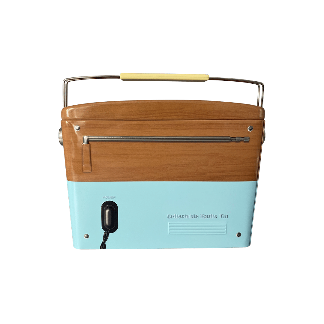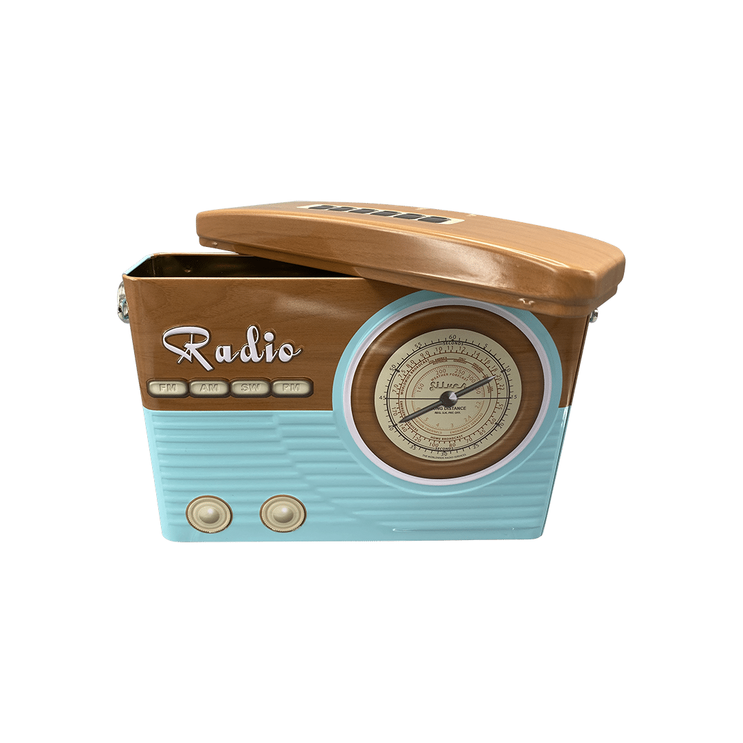 Radio kagedåse turkis. Kagedåsen er udformet som en flot gammeldags retro radio, med håndtag, antenne mm. Fronten er turkis og nøddetræs look, og bagside med antenne, og strømstik. Dåsen åbnes foroven. Ville være god til kaffepads, havregryn, cornflakes, slik, kager, opvaske tabs, eller hvad du lige finder på.