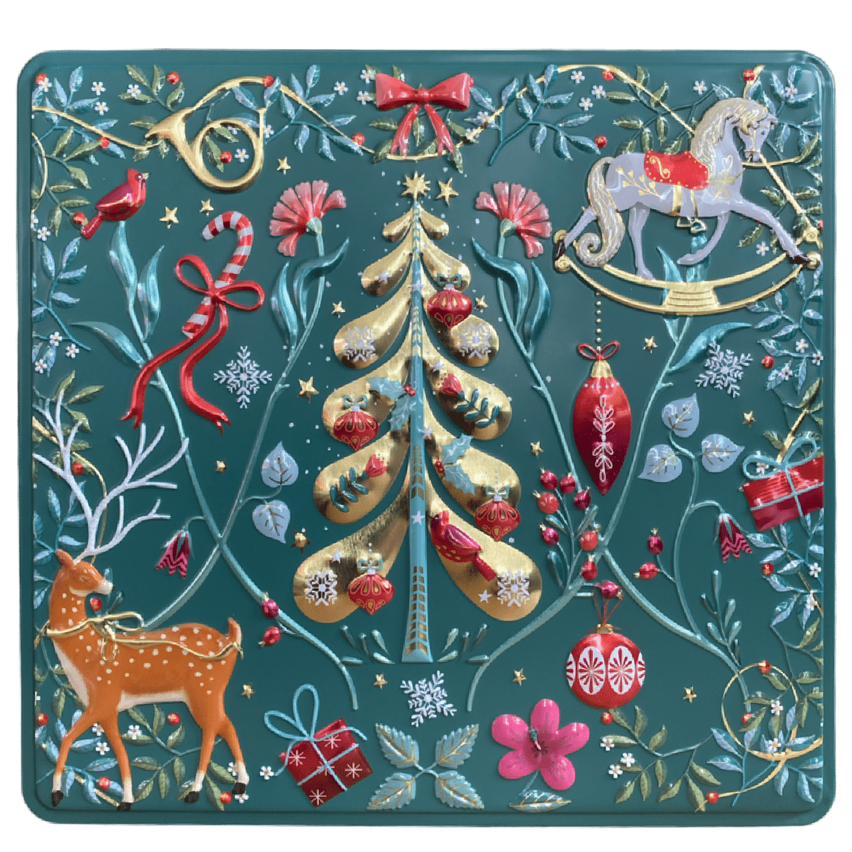 Hvis du betragter dåsen endnu mere, vil du også finde blomster, julegaver, sukkerstok, rød juletræsdråbe, sløjfer, trompet, fugle mm.