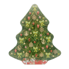 Det grønne juletræ er pyntet med røde juletræskugler, guld ornamenter som snemand, snefnug juletræ, honningkagemand, hjort samt guld kuglekæde og sløjfer.