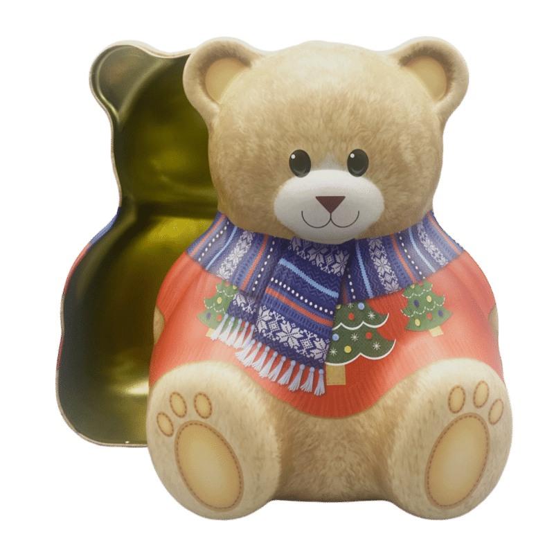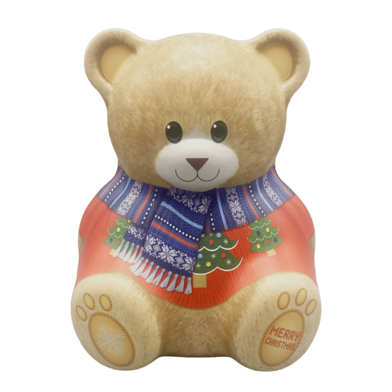 Sød buttet bamse med juletrøje samt vinterlig halstørklæde.