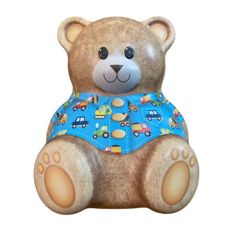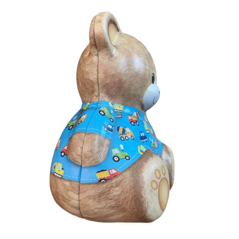Sød buttet drenge bamse med en fed blå skjorte med biler., traktor, lastbiler, gravko mm.
