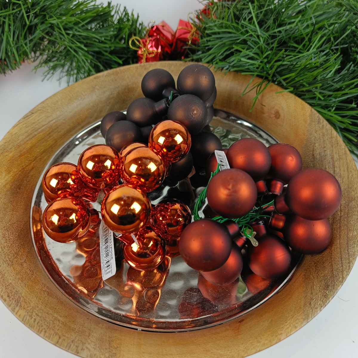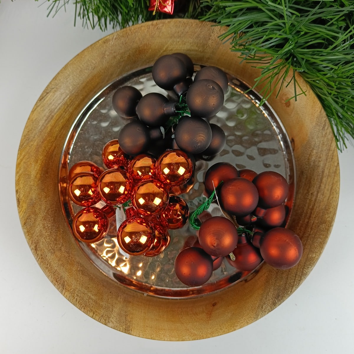 Silkematte og blanke kobber, og silkematte brune glas juletræs kugler i Ø 2,5 cm med stål tråd til dekorationer, kranse, juletræet mm.
