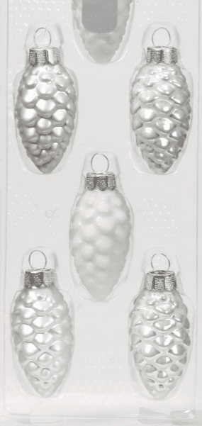 Farve: Silkematte og blanke hvide/sølv kogler med hvidt/ sølvglimmer.