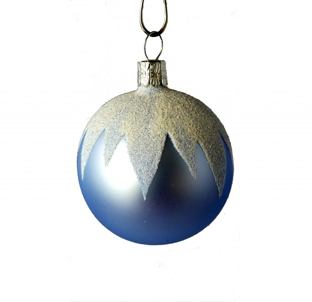Lyseblå juletræskugle med hvid glimmer, er i mundblæst glas. Vintage lyseblå silkemat mundblæst glas juletræs kugle. Dekoreret med hvidt glimmer, som ligner istapper.