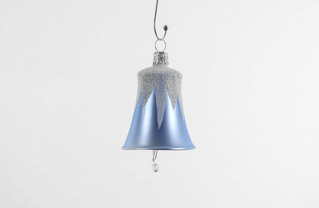 Smuk lyseblå klokke, med glimmer istapper. Kuglen er i mundblæst og efterfølgende hånd dekoreret.