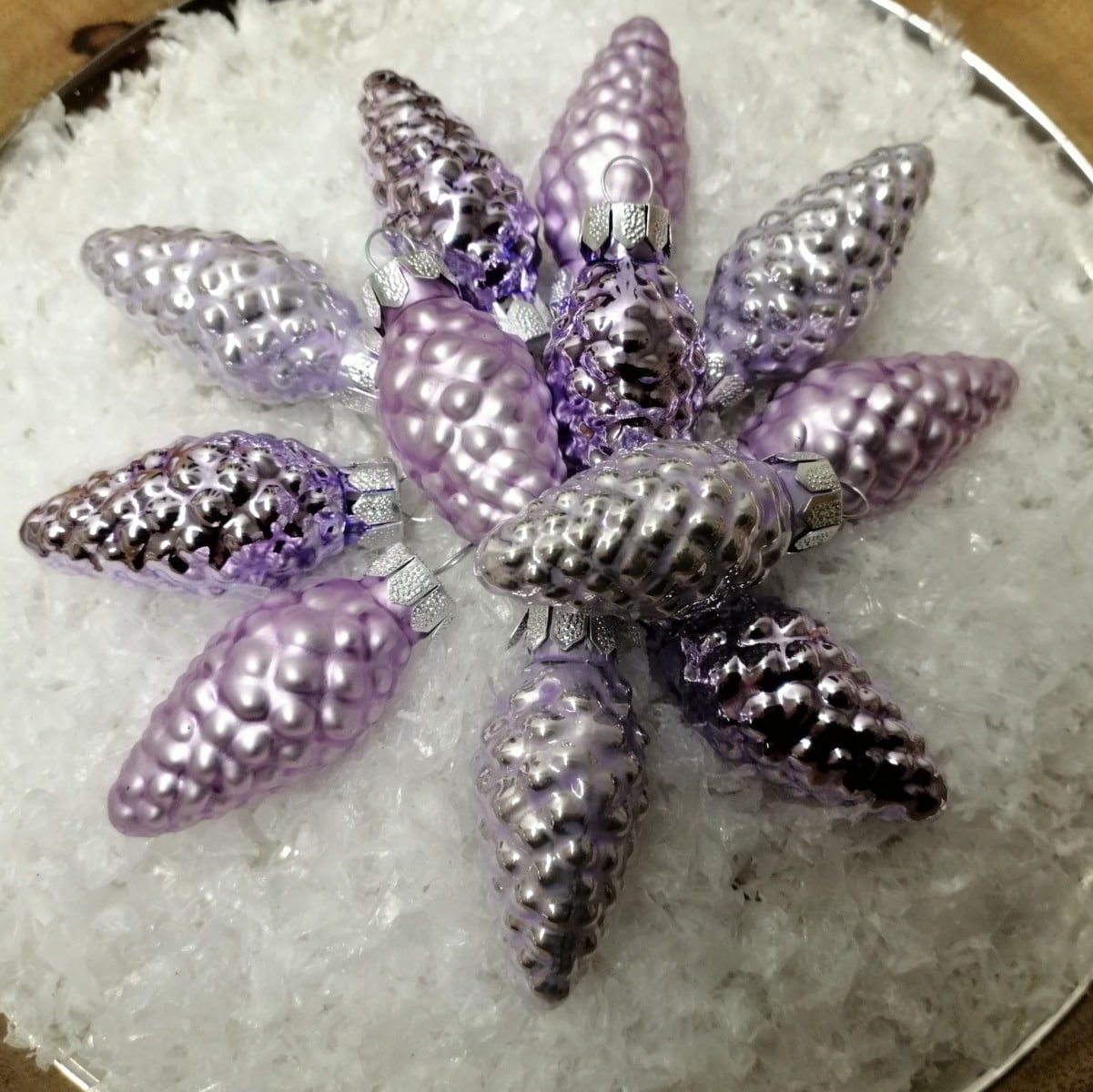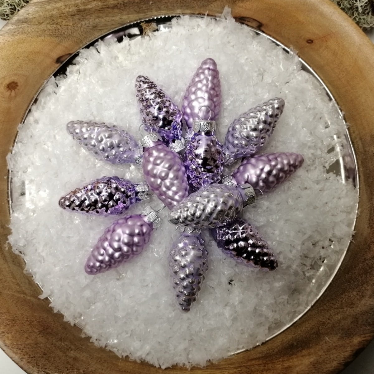 Lyselilla kogler til juletræet i et miks af lilla, lyselilla, og helt sart lyselilla. Koglerne er lavet i glas. Str. 4,5 cm 12 stk. pr. æske.