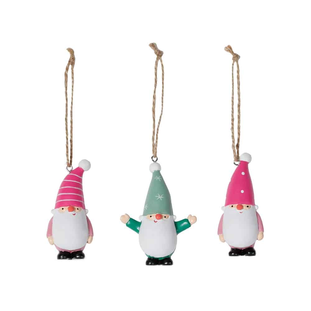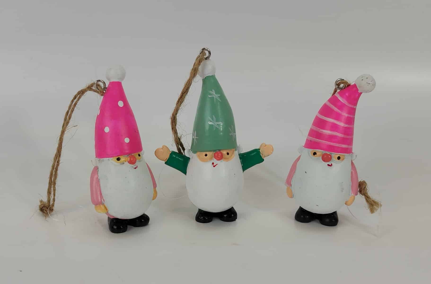 Skab en varm og nutidig julestemning med disse nisse juletræsophæng. De små håndmalede nisser er udført i polyresin og har hvert sit udtryk – én med rosa striber, én i mint med hvide stjerner og én i klassisk pink med prikker.