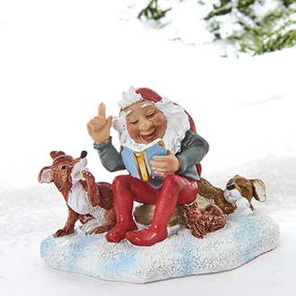 Julemanden fra Nissernes Jul af Carla og Vilhem Hansens julefigurer, sidder og læser højt for skovens dyr.